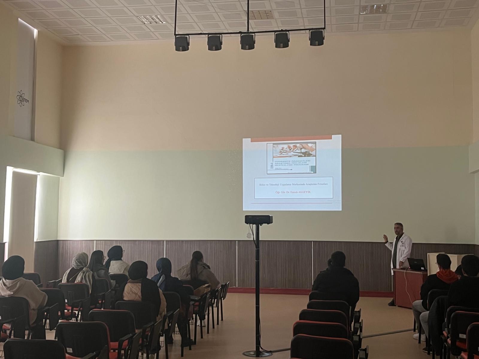 Öğr. Gör. Dr. Emrah AKGEYİK tarafından 4 Aralık 2025 tarihinde BİLTEM Laboratuvarında, Fen Edebiyet Fakültesi Moleküler Biyoloji öğrencilerine yönelik olarak "Lisans öğrencilerine Ar-Ge çalışmaları için BİLTEM altyapı hizmetlerinin tanıtılması" adlı etkinlik gerçekleştirilmiştir. Söz konusu eğitimde Lisans öğrencilerinin merkezimiz alt yapısını tanıması amaçlanmıştır. Bu kapsamda Tübitak 2209 ve diğer Ar-Ge projeleri için merkezimiz merkez alt yapısının tanıtımı yapılmıştır. Eğitim kapsamında Lisans öğrencilerine Ar-Ge çalışmaları yapabilmeleri için farkındalık oluşturulması sağlanmıştır.. Bu bağlamda BİLTEM' in iç paydaşı olan öğrencilerimizle iletişim kurularak merkezimizin yapabileceği katkılar anlatılmıştır.