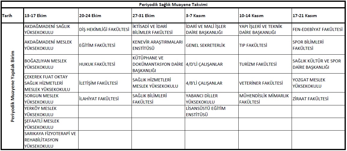 Üniversitemiz bünyesinde görev yapan tüm çalışanların (akademik, idari ve 4D'li sürekli işçi) periyodik sağlık muayenelerinin yapılması için bir takvim oluşturulmuş olup, bu takvim ekte yer almaktadır. Çalışanların periyodik sağlık muayenelerini yaptırmak için ekte verilen takvime uygun olarak Üniversitemiz Araştırma ve Uygulama Hastanesi 2. kat çocuk polikliniği bölümünde yer alan İSG polikliniğine direk giriş yaptırmadan başvurmaları yeterli olacaktır. Tetkiklerin isteminden sonra işyeri hekimi tarafından gerekli işlemler yürütülüp bilgilendirmeler yapılacaktır.