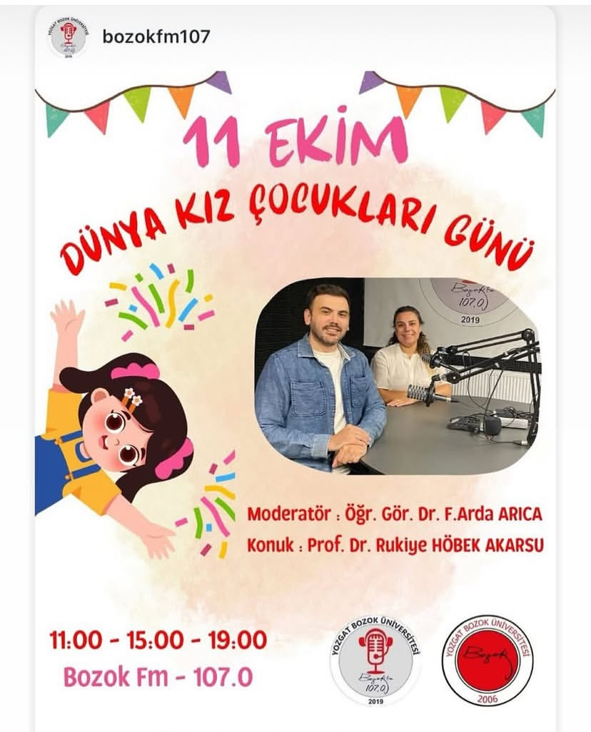 Öğr. Gör. Dr. Arda Arıca moderatörlüğünde, merkez müdürümüz Prof.Dr.Rukiye Höbek Akarsu'nun 11 Ekim Dünya Kız Çocukları özel Programı üniversitenin sesi Bozok FM'de gerçekleştirildi. Müdürümüz Dünya Kız Çocukları Günü, kız çocuklarının karşılaştığı zorlukların ele alınması ve kız çocuklarının güçlendirilmesi ile insan haklarının hayata geçirilmesinin teşvik edilmesi gerekliliğine dikkat çekmiştir.