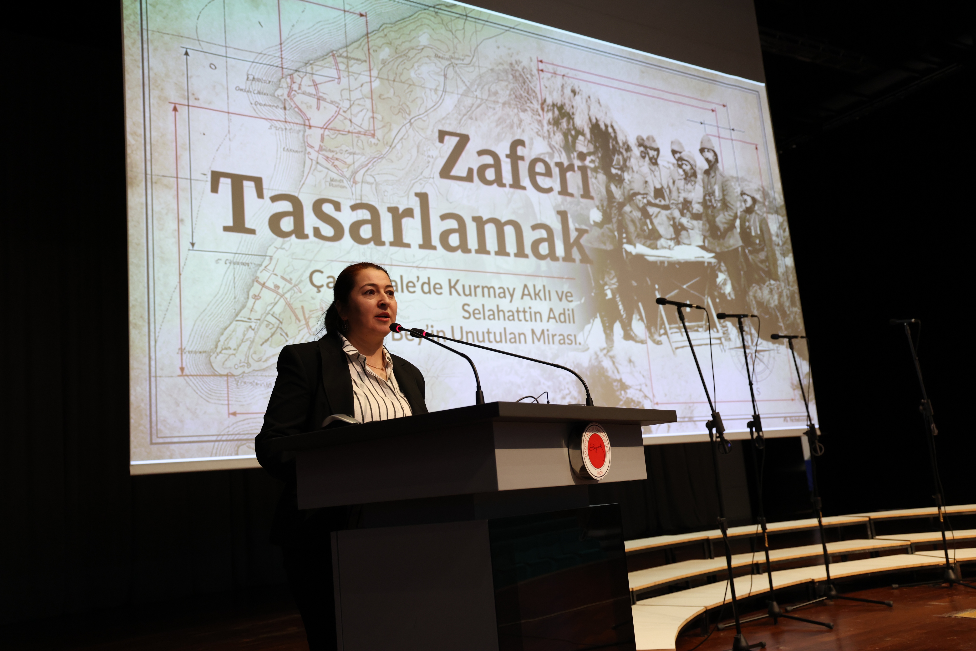 Programda, Üniversitemiz Öğr. Gör. Dr. Döndü Sena Göndürü “Çanakkale Kahramanlarından Yüzbaşı Mehmet Selahattin Adil Bey, Çanakkale Müstahkem Mevki Kurmay Başkanı” konulu konferans verdi. Konferansta, Çanakkale Savaşı’nda Yüzbaşı Mehmet Selahattin Adil Bey’in hayatı, görevleri, askeri stratejilere katkıları ve savaşın seyrindeki etkisi ele alındı. Çanakkale Zaferi’nin, yalnızca askeri bir başarı değil; aynı zamanda aklın, planlamanın ve disiplinin zaferi olduğunu ifade eden Öğr. Gör. Dr. Göndürü konuşmasının devamında: “Çanakkale Savaşı denildiğinde akla çoğunlukla cephedeki kahramanlıklar gelir. Oysa bu zafer, yalnızca siperlerde değil; harita başında, plan masasında ve askeri koordinasyon merkezlerinde de kazanılmıştır. İşte bu noktada Selahattin Adil Bey'in rolü belirleyici olmuştur. Selahattin Adil Bey, bu direnişin görünmeyen mimarlarından biri olarak, savaşın kaderini etkileyen kritik katkılar sunmuştur. Bugün onu anmak, yalnızca bir subayı hatırlamak değil; aynı zamanda Çanakkale’yi kazandıran kurmay zihniyeti anlamaktır.” dedi.