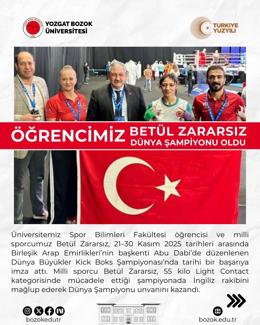 Üniversitemiz Spor Bilimleri Fakültesi öğrencisi ve milli sporcumuz Betül Zararsız, 21–30 Kasım 2025 tarihleri arasında Birleşik Arap Emirlikleri’nin başkenti Abu Dabi’de düzenlenen Dünya Büyükler Kick Boks Şampiyonası’nda önemli bir başarıya imza attı.