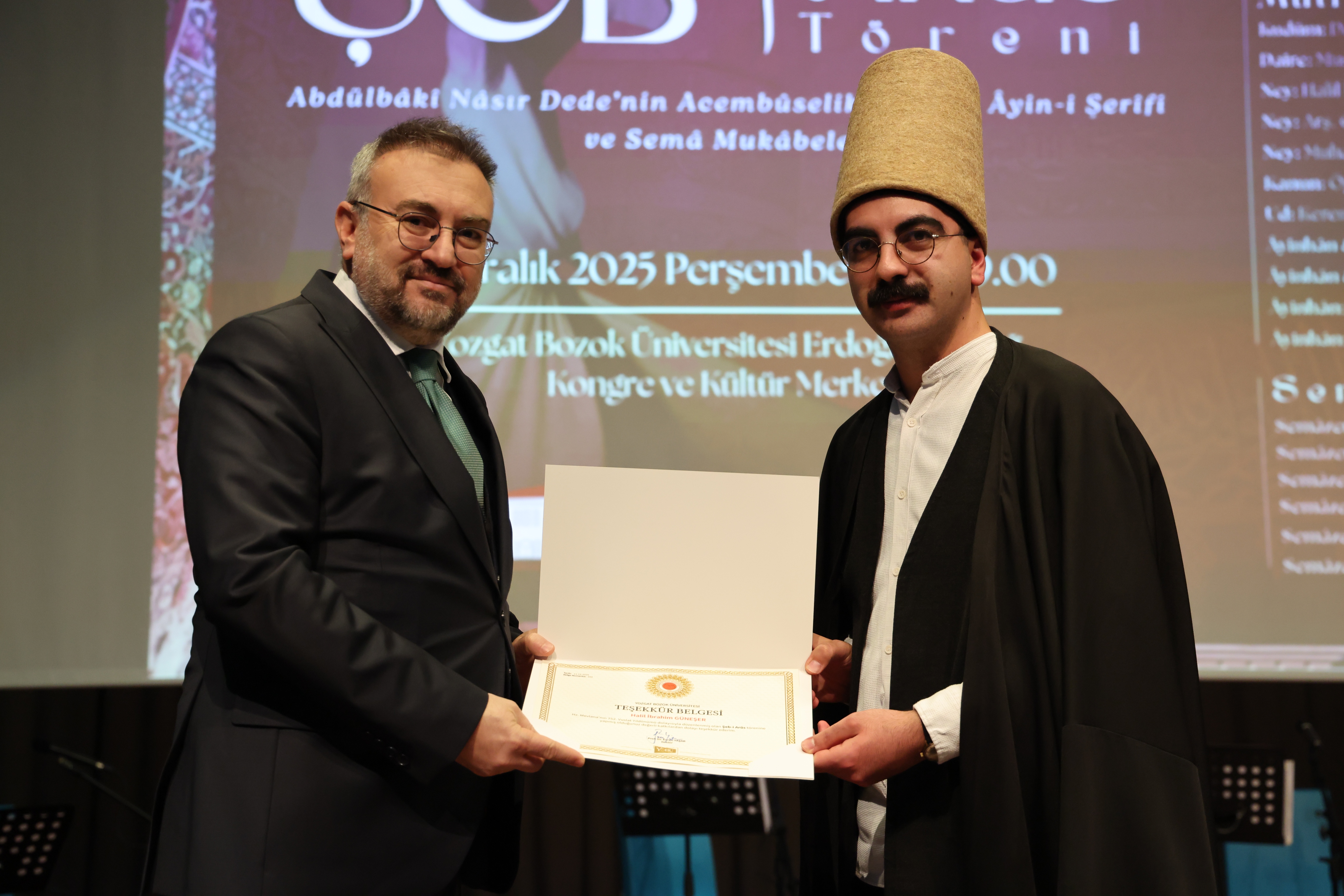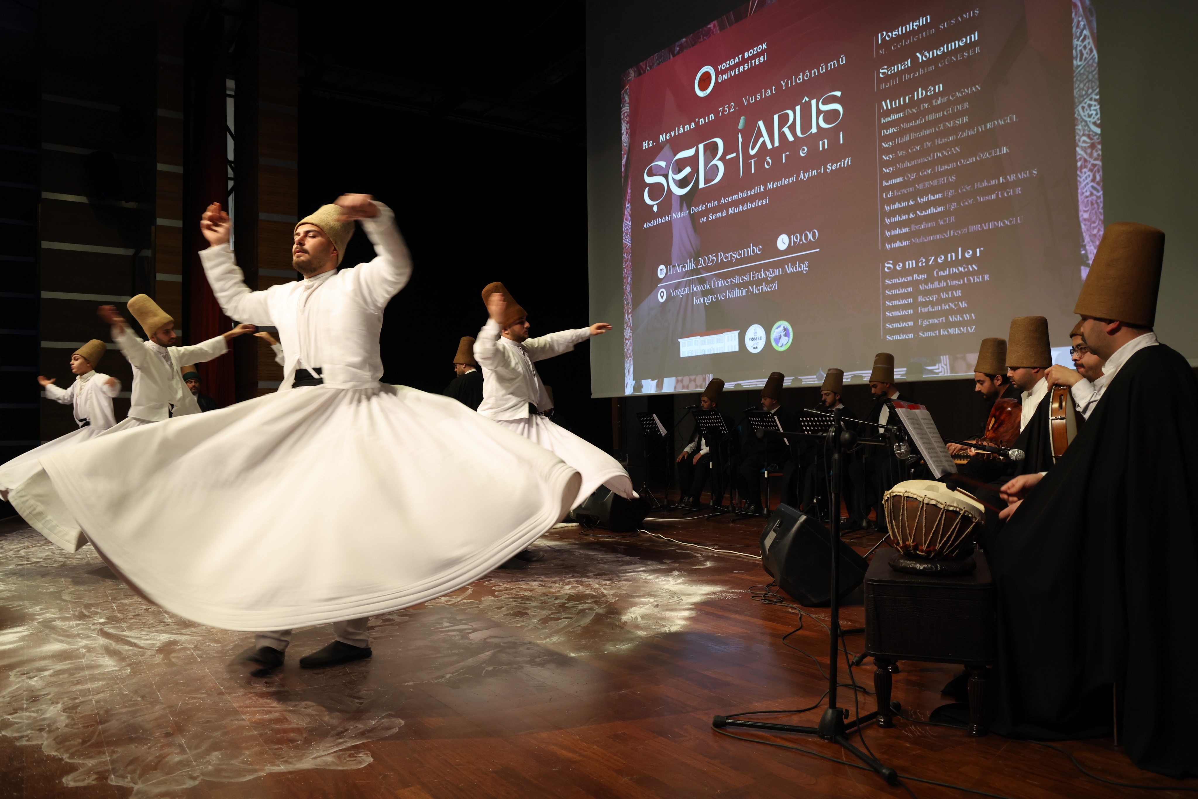 Sakarya Üniversitesi İlahiyat Fakültesi Öğretim Üyesi Prof. Dr. Sezai Küçük’ün Mevlevi Ayin geleneğinden olan Mesnevi dersi ile başlayan tören, Abdülbâkî Nâsır Dede’nin Acembuselik Mevlevî Âyini’nin icrası ile devam etti. Mevlevî geleneğinin temel unsurlarını yansıtan ayin, mutrıb heyeti tarafından özenle sunuldu.
