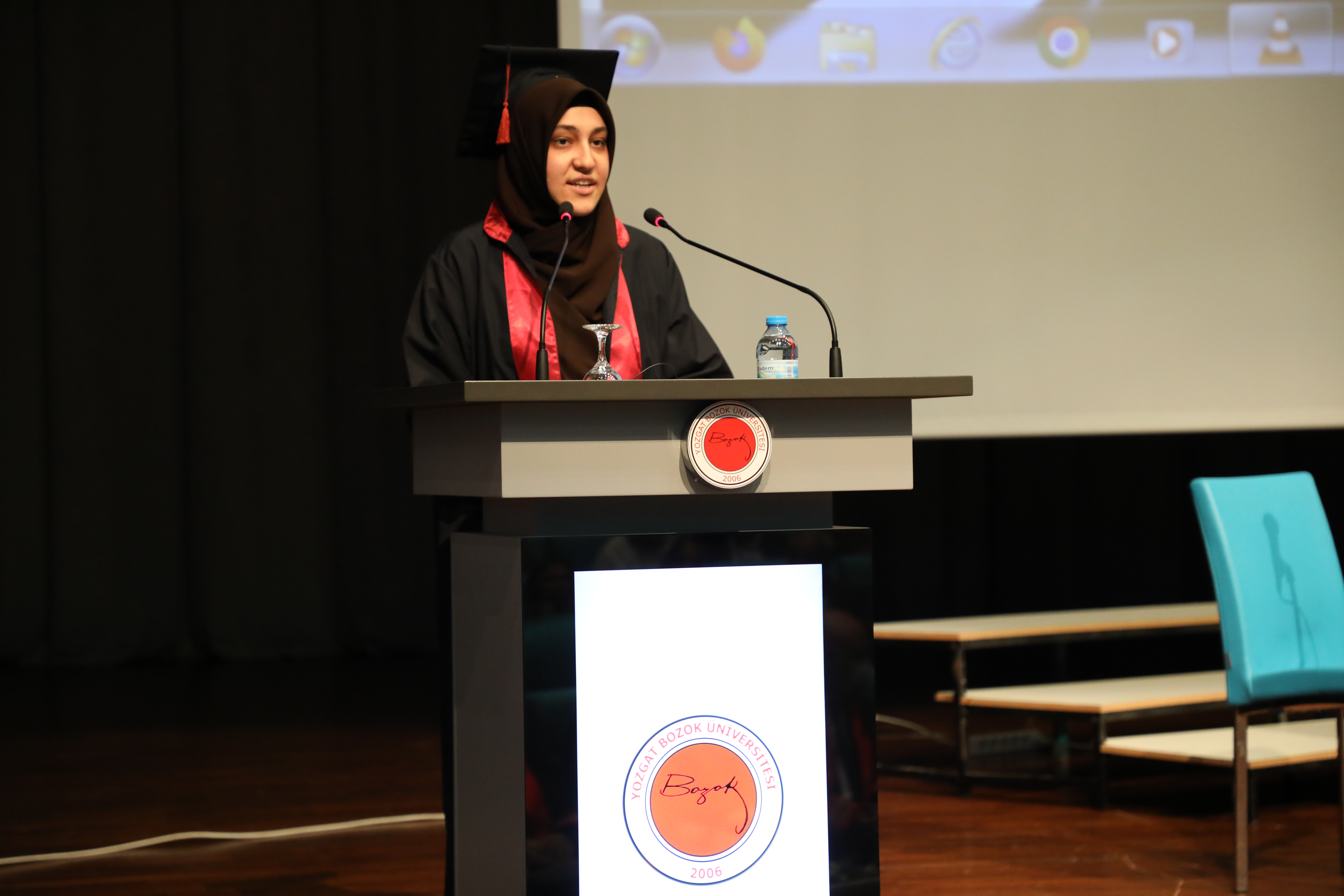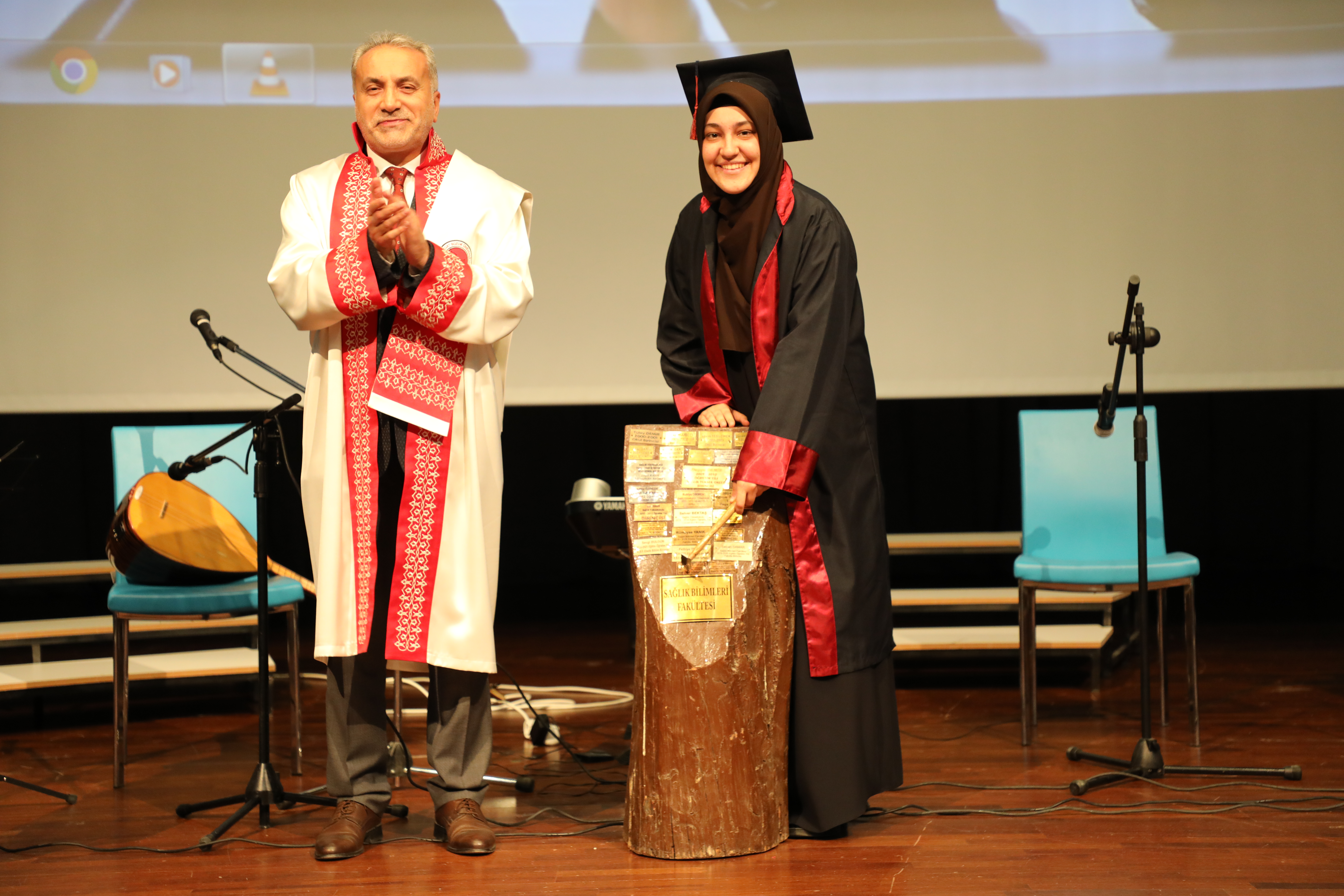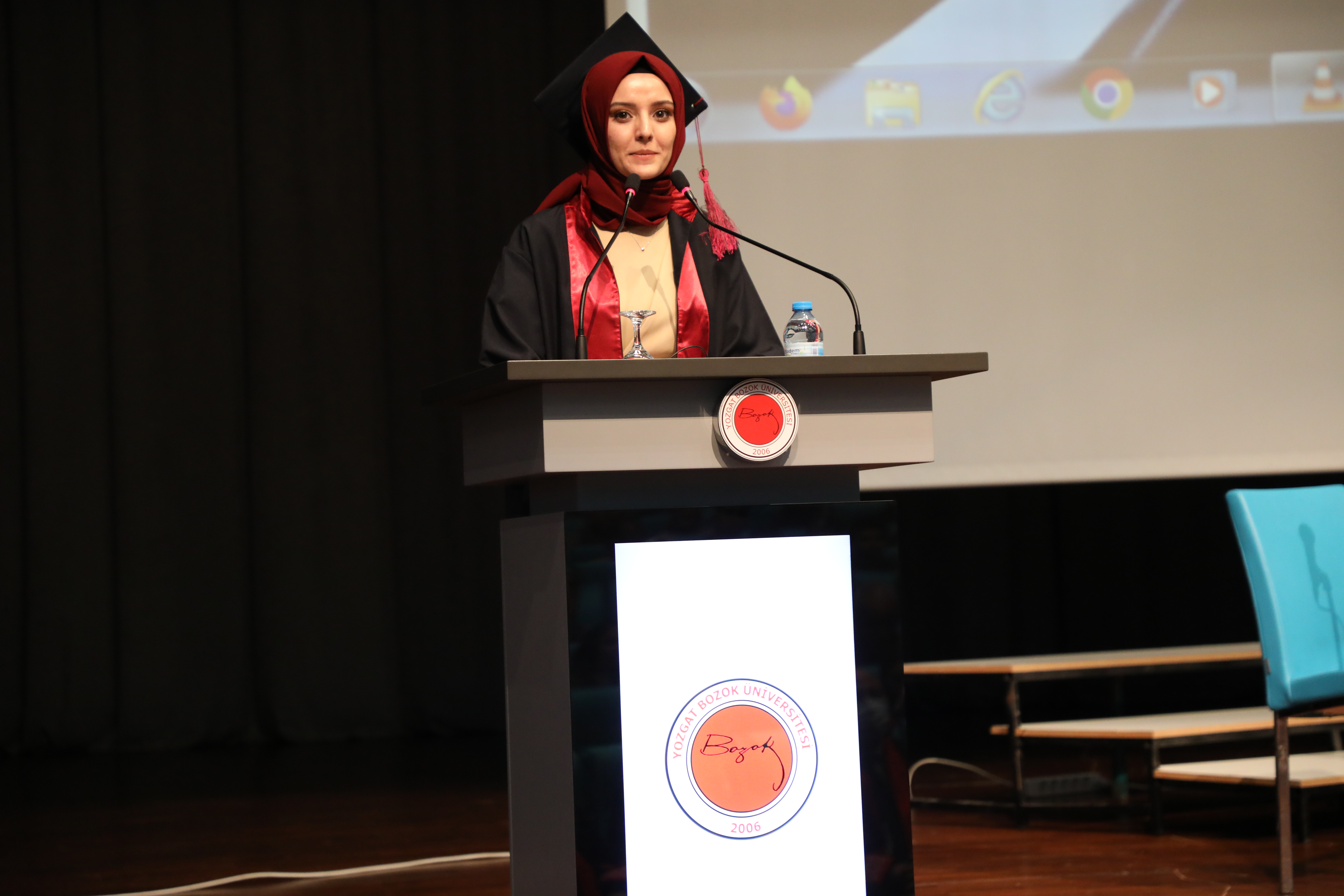 Saygı duruşu ve İstiklal Marşı ile başlayan mezuniyet töreni, Fakülte birincileri Tuğba Birinci ve Hatice Kevser Çankaya’nın mezun öğrenciler adına yaptığı konuşma ile devam etti.