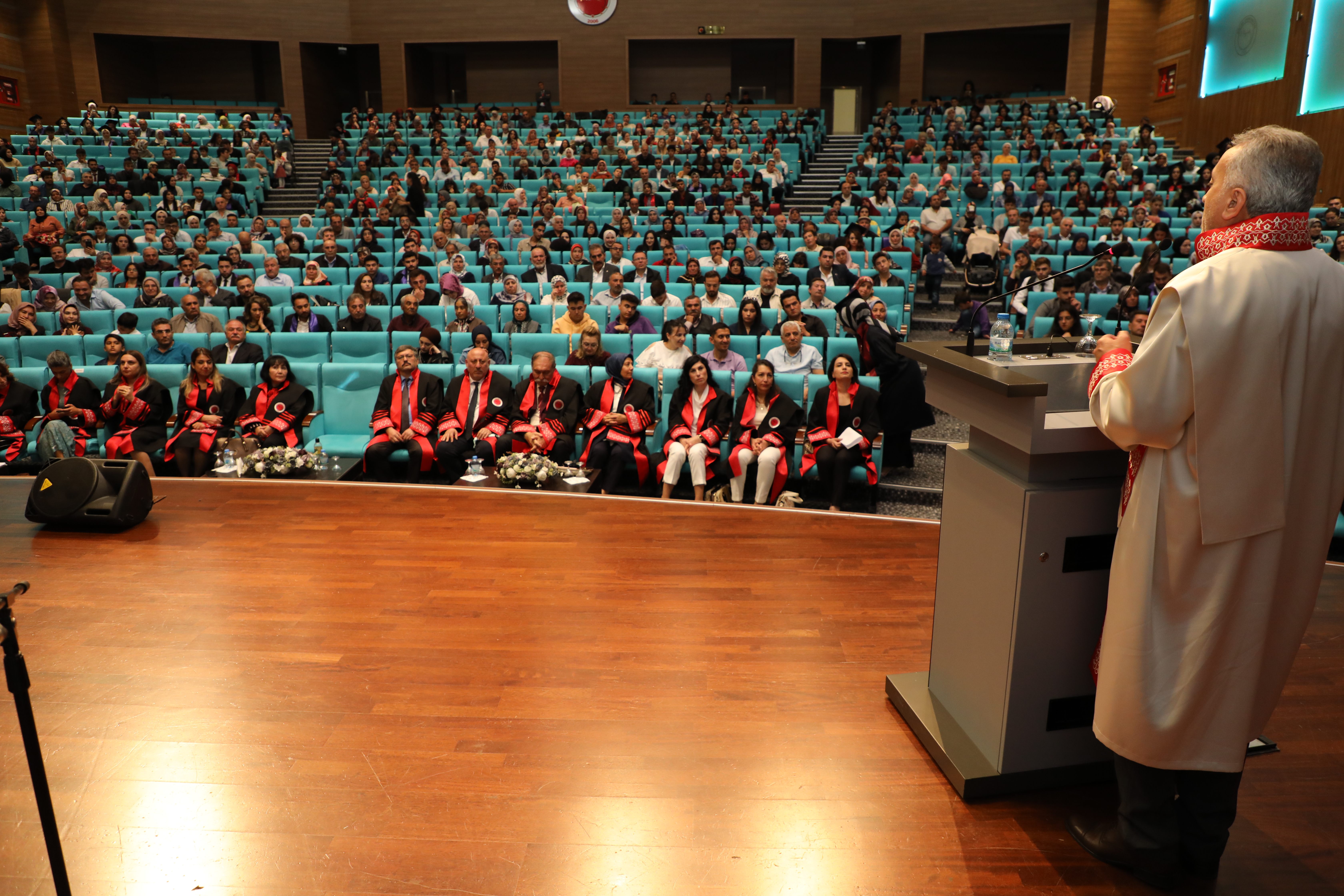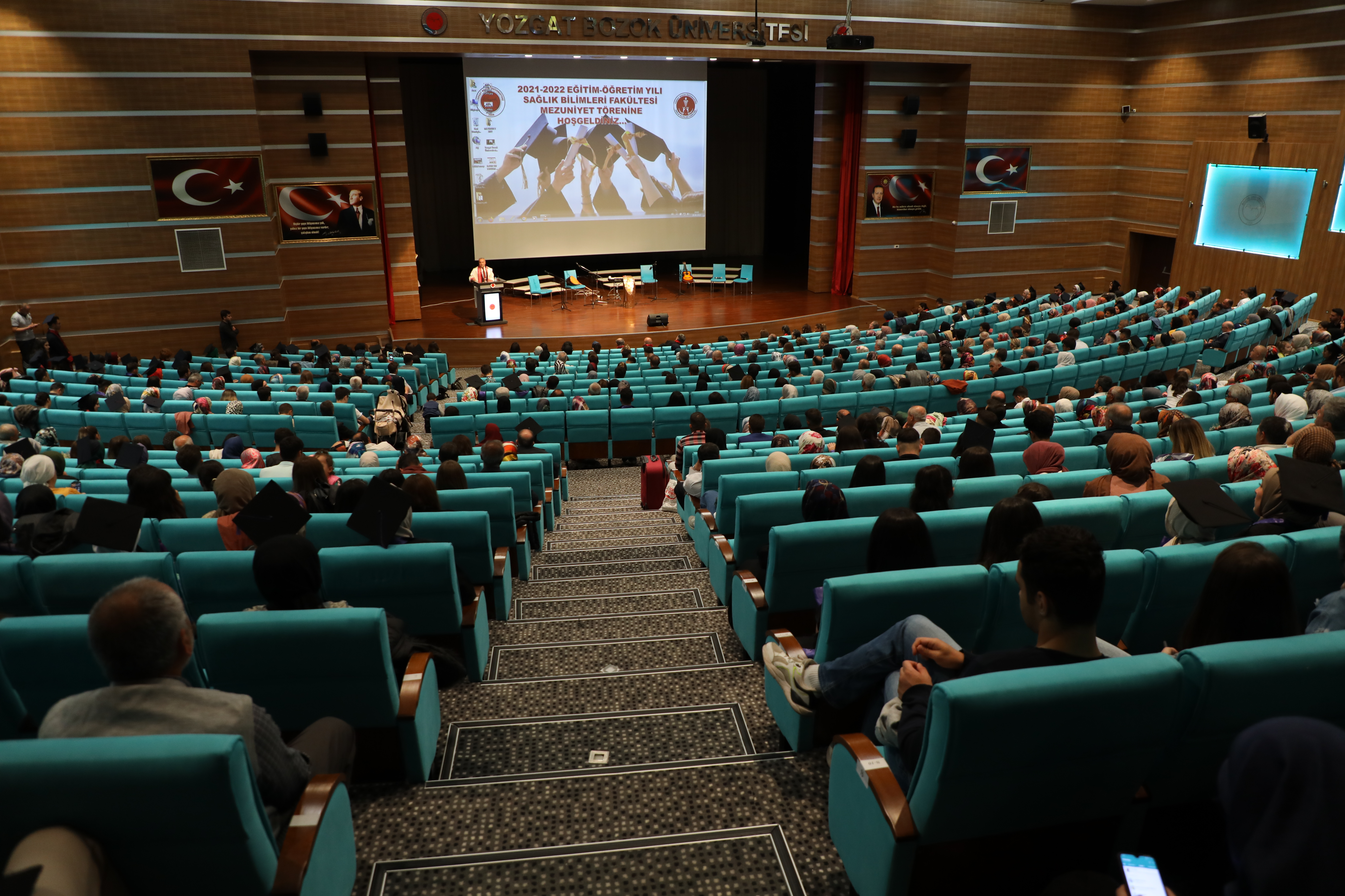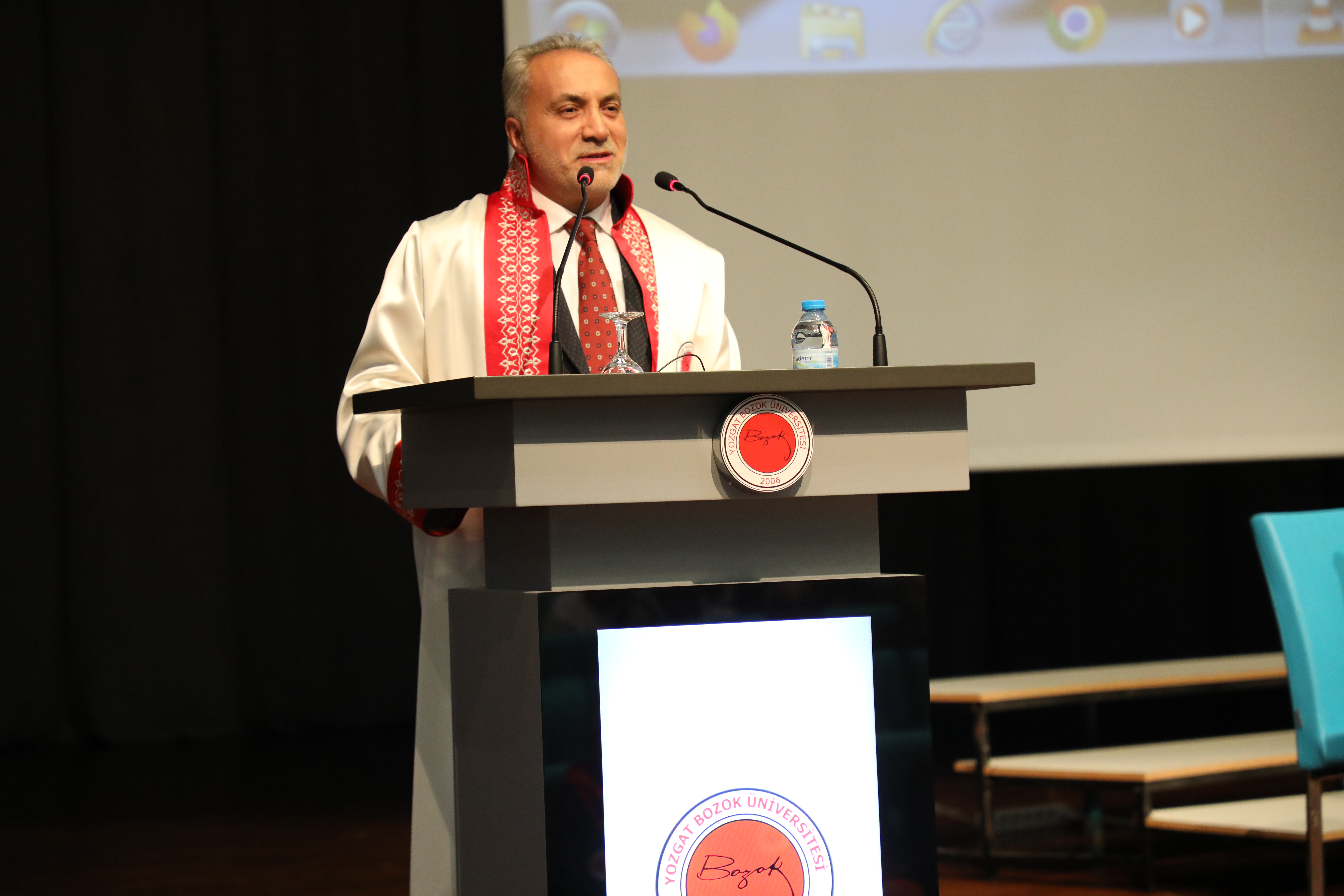 Rektörümüz konuşmasının devamında şunları söyledi: “Yarınlarımız, geleceğimiz olan Sevgili Gençler! Bizler bayrağı sizlere emanet edeceğiz. Sağlık sektöründe çok önemli görevler ifa edeceksiniz. Sizin donanımlarınız bu ülkenin yarınlarının daha aydınlık olması anlamına gelmektedir. Yozgat Bozok Üniversitesi bu idealle, bu hedef ve mottoyla sizleri en iyi şekilde yetiştirme gayret ve çabası içinde oldu. Bu açıdan ben üniversite rektörü olarak müsterihim. Başarının mimarı sizlersiniz. Şu anda başarıya şahitlik ediyorsak ya da sizler bugün anlamlı bir başarı hikâyesini kaleme alıyorsanız bu sizlerin azim ve çabasıyla olmuş demektir. Hiçbir başarı tesadüfi olmadığı gibi tek başına da değerlendirilemez. Başarının kaynağı siz olmakla birlikte başarınızın perçinlenmesinde fedakârlıkları ve özverileriyle gizli kahraman olan ebeveynlerinize de ayrı teşekkür etmek istiyorum. Bu ülkenin yarınlarına yönelik hayalleri olan idealleri olan evlatlar yetiştirdiğiniz için siz değerli velilere çok ama çok teşekkür ediyorum. Sizleri bugünlere taşıyan, sizi meslek sahibi yapan hocalarınızı da yürekten alkışlıyorum. Başarı kolektif aklın birlikte hareket etmenin, birlikte düşünmenin, birlikte karar vermenin ve birlikte yol haritası çizmenin ana unsurudur. Dolayısıyla burada bir başarı hikâyesinden bahsediyorsak bu başarının mimarları öğrenciler, hocaları ve siz değerli ebeveynlerisiniz.