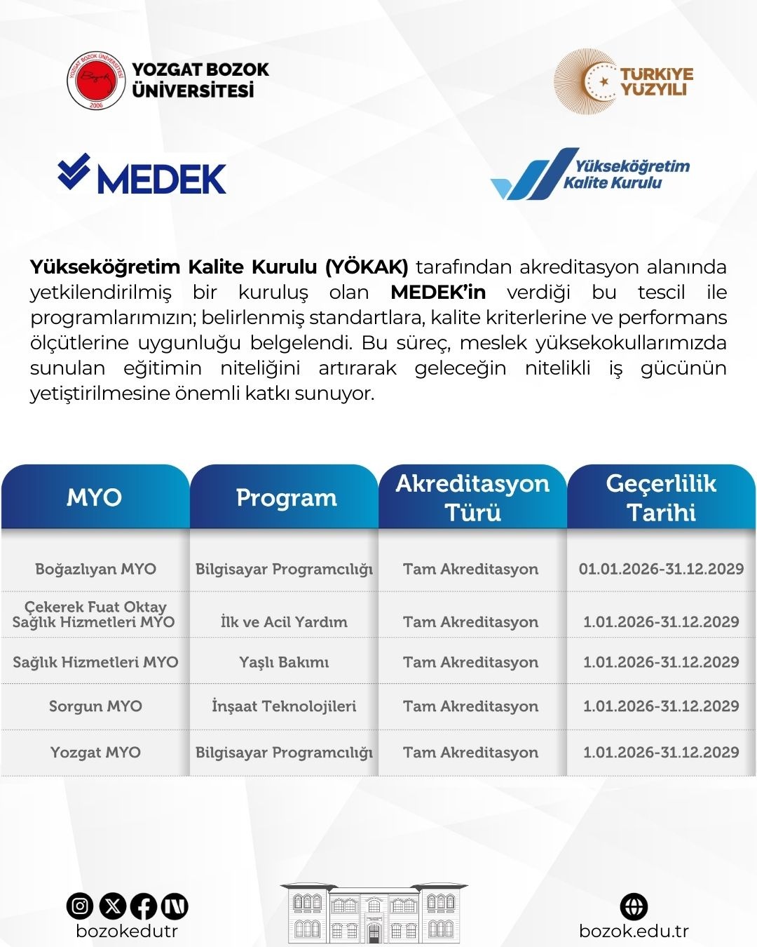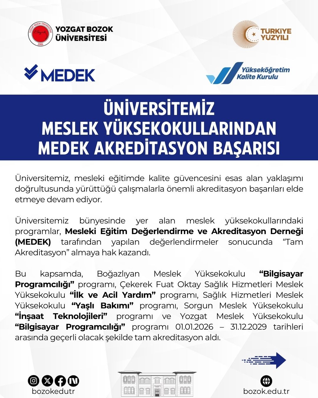 Bu kapsamda, Boğazlıyan Meslek Yüksekokulu “Bilgisayar Programcılığı” programı, Çekerek Fuat Oktay Sağlık Hizmetleri Meslek Yüksekokulu “İlk ve Acil Yardım” programı, Sağlık Hizmetleri Meslek Yüksekokulu “Yaşlı Bakımı” programı, Sorgun Meslek Yüksekokulu “İnşaat Teknolojileri” programı ve Yozgat Meslek Yüksekokulu “Bilgisayar Programcılığı” programı 01.01.2026 – 31.12.2029 tarihleri arasında geçerli olacak şekilde tam akreditasyon aldı.