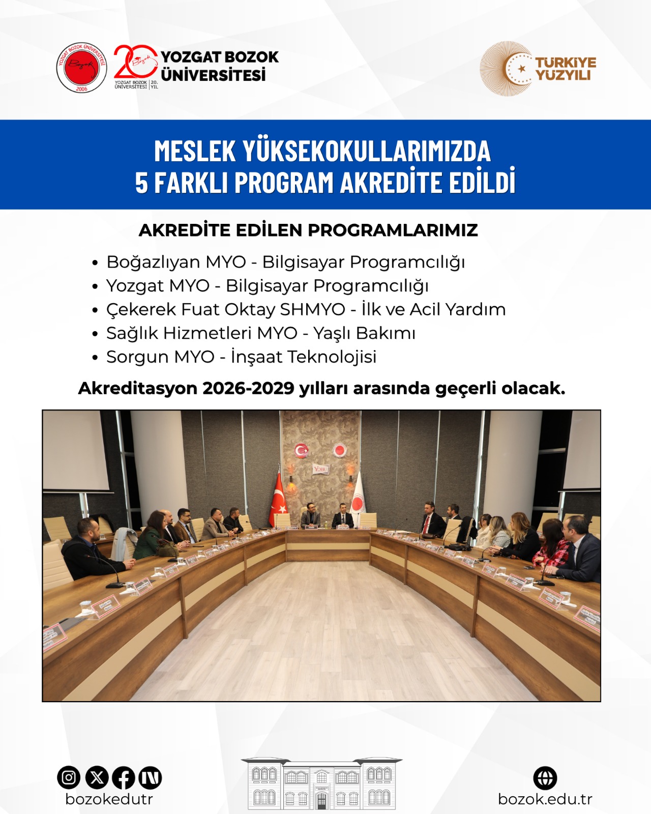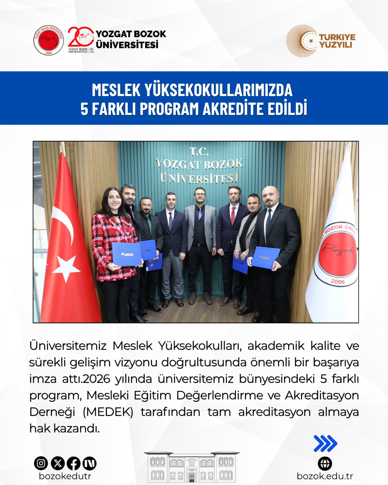 Üniversitemiz Meslek Yüksekokulları, akademik kalite ve sürekli gelişim vizyonu doğrultusunda önemli bir başarıya imza attı.2026 yılında üniversitemiz bünyesindeki 5 farklı program, Mesleki Eğitim Değerlendirme ve Akreditasyon Derneği (MEDEK) tarafından tam akreditasyon almaya hak kazandı. Akredite edilen programlar arasında Boğazlıyan MYO ve Yozgat MYO Bilgisayar Programcılığı, Çekerek Fuat Oktay Sağlık Hizmetleri MYO İlk ve Acil Yardım, Sağlık Hizmetleri MYO Yaşlı Bakımı ve Sorgun MYO İnşaat Teknolojisi bölümleri yer aldı.