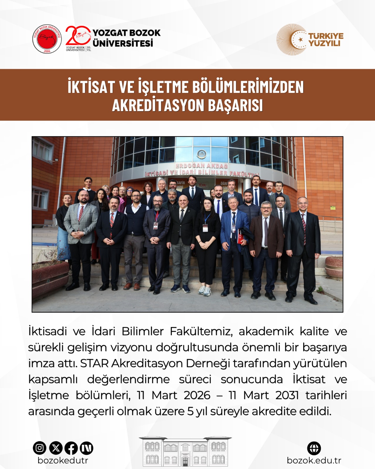 İktisadi ve İdari Bilimler Fakültemiz, akademik kalite ve sürekli gelişim vizyonu doğrultusunda önemli bir başarıya imza attı. STAR Akreditasyon Derneği tarafından yürütülen kapsamlı değerlendirme süreci sonucunda, İşletme ve İktisat Bölümlerimiz; eğitim-öğretim kalitesi, akademik yetkinlik, araştırma kapasitesi ve kurumsal altyapı açısından ulusal standartlara uygunluğu tescillenerek 11 Mart 2026 – 11 Mart 2031 tarihleri arasında geçerli olmak üzere 5 yıl süreyle akredite edildi.