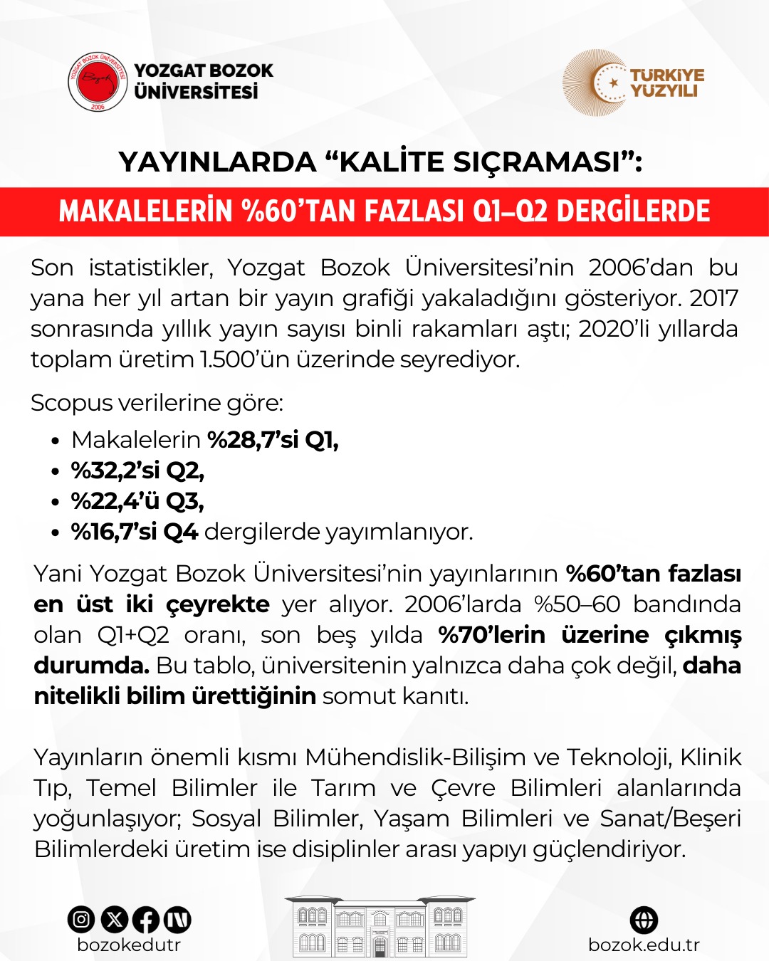 Son istatistikler, Yozgat Bozok Üniversitesi’nin 2006’dan bu yana her yıl artan bir yayın grafiği yakaladığını gösteriyor. 2017 sonrasında yıllık yayın sayısı binli rakamları aştı; 2020’li yıllarda toplam üretim 1.500’ün üzerinde seyrediyor.