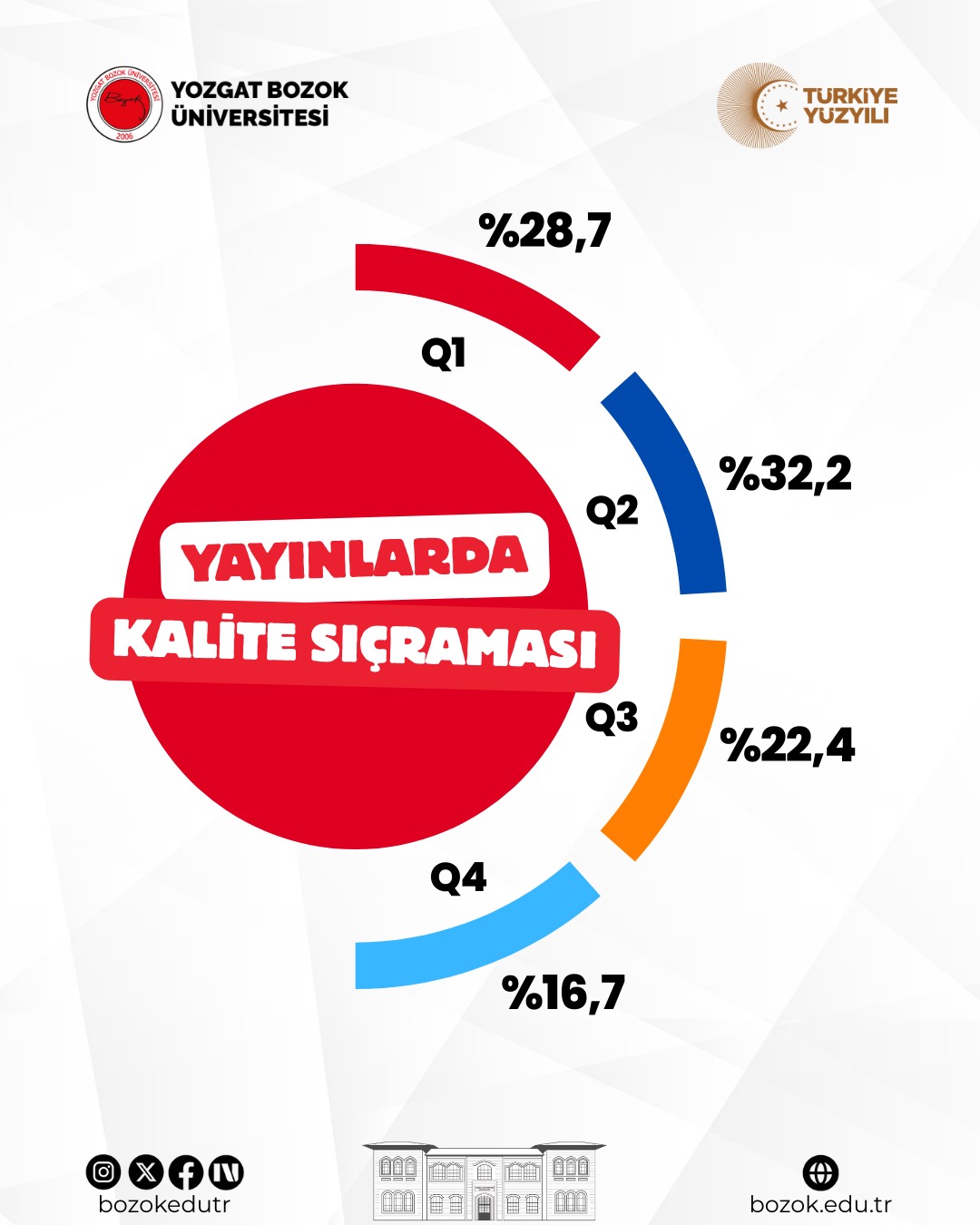 Yani Yozgat Bozok Üniversitesi’nin yayınlarının %60’tan fazlası en üst iki çeyrekte yer alıyor. 2006’larda %50–60 bandında olan Q1+Q2 oranı, son beş yılda %70’lerin üzerine çıkmış durumda. Bu tablo, üniversitenin yalnızca daha çok değil, daha nitelikli bilim ürettiğinin somut kanıtı.