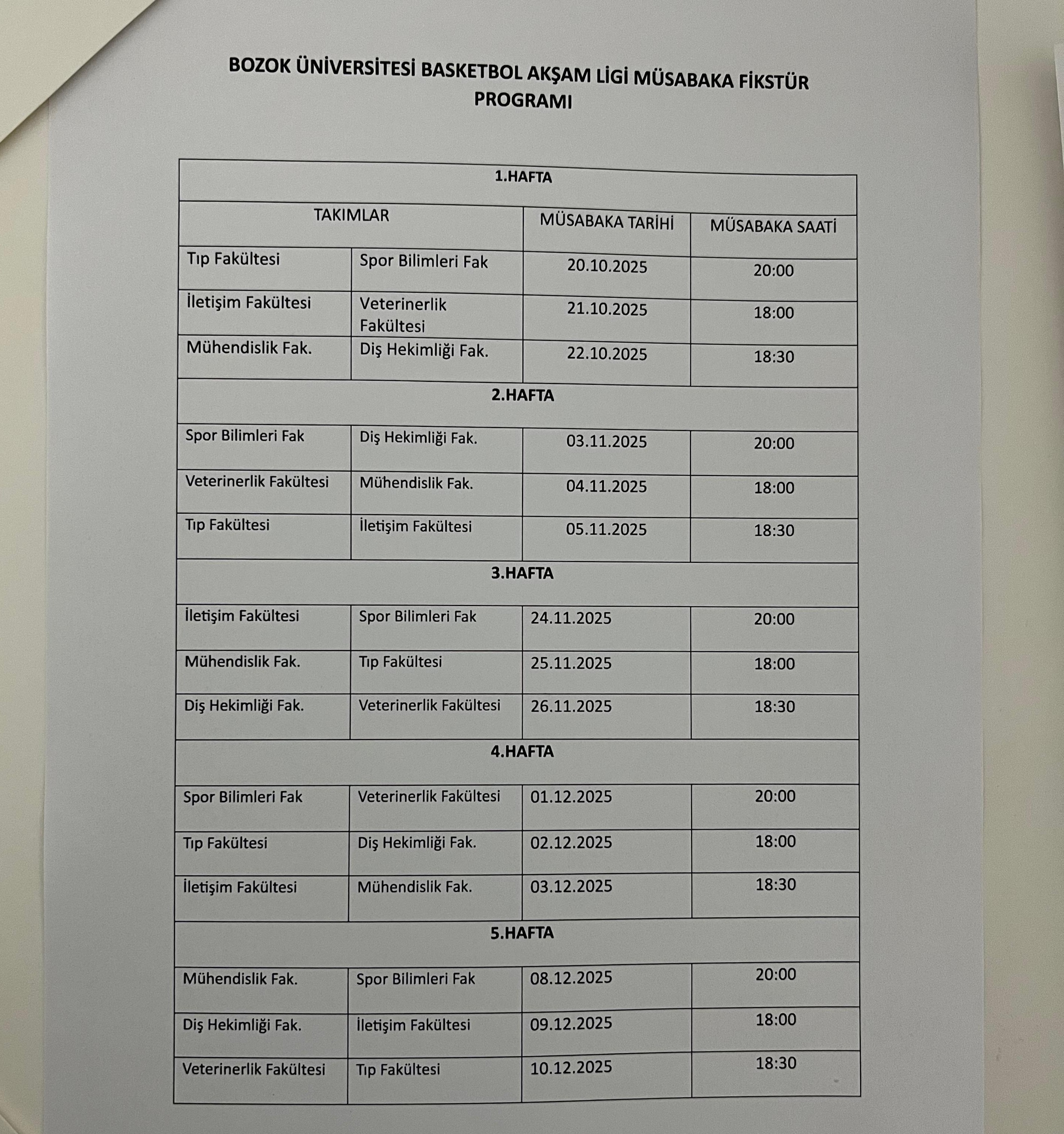Tıp Fakültesi, İletişim Fakültesi, Mühendislik Mimarlık Fakültesi, Spor Bilimleri Fakültesi, Veteriner Fakültesi ve Diş Hekimliği Fakültesi'nden oluşan ligde 5 haftalık fikstürün ilk müsabakalarında Üniversitemiz Tıp Fakültesi- Spor Bilimleri Fakültesi ve İletişim Fakültesi-Veterinerlik Fakültesi karşı karşıya geldi. Öğrencilerin galibiyet için ter döktükleri kıyasıya mücadelelerde fakülteler arası dostluk ve centilmenlik örneği sergilendi.