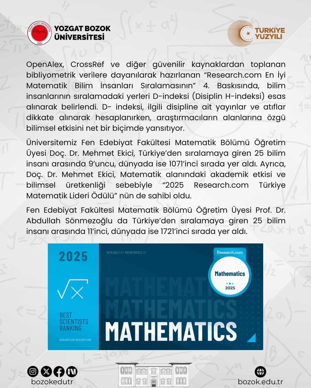 Üniversitemiz Fen Edebiyat Fakültesi Matematik Bölümü Öğretim Üyesi Doç. Dr. Mehmet Ekici, Türkiye’den sıralamaya giren 25 bilim insanı arasında 9’uncu, dünyada ise 1071’inci sırada yer aldı. Ayrıca, Doç. Dr. Mehmet Ekici, Matematik alanındaki akademik etkisi ve bilimsel üretkenliği sebebiyle “2025 Research.com Türkiye Matematik Lideri Ödülü” nün de sahibi oldu.