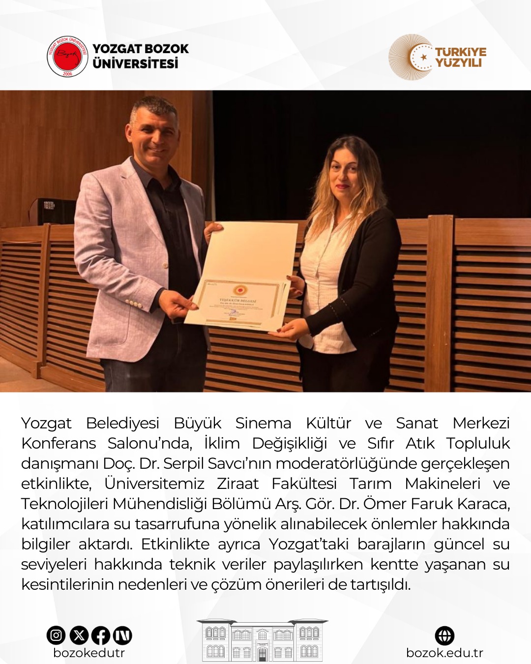 Yozgat Belediyesi Büyük Sinema Kültür ve Sanat Merkezi Konferans Salonu’nda, İklim Değişikliği ve Sıfır Atık Topluluk danışmanı Doç. Dr. Serpil Savcı’nın moderatörlüğünde gerçekleşen etkinlikte, Üniversitemiz Ziraat Fakültesi Tarım Makineleri ve Teknolojileri Mühendisliği Bölümü Arş. Gör. Dr. Ömer Faruk Karaca, katılımcılara su tasarrufuna yönelik alınabilecek önlemler hakkında bilgiler aktardı. Etkinlikte ayrıca Yozgat’taki barajların güncel su seviyeleri hakkında teknik veriler paylaşılırken kentte yaşanan su kesintilerinin nedenleri ve çözüm önerileri de tartışıldı.