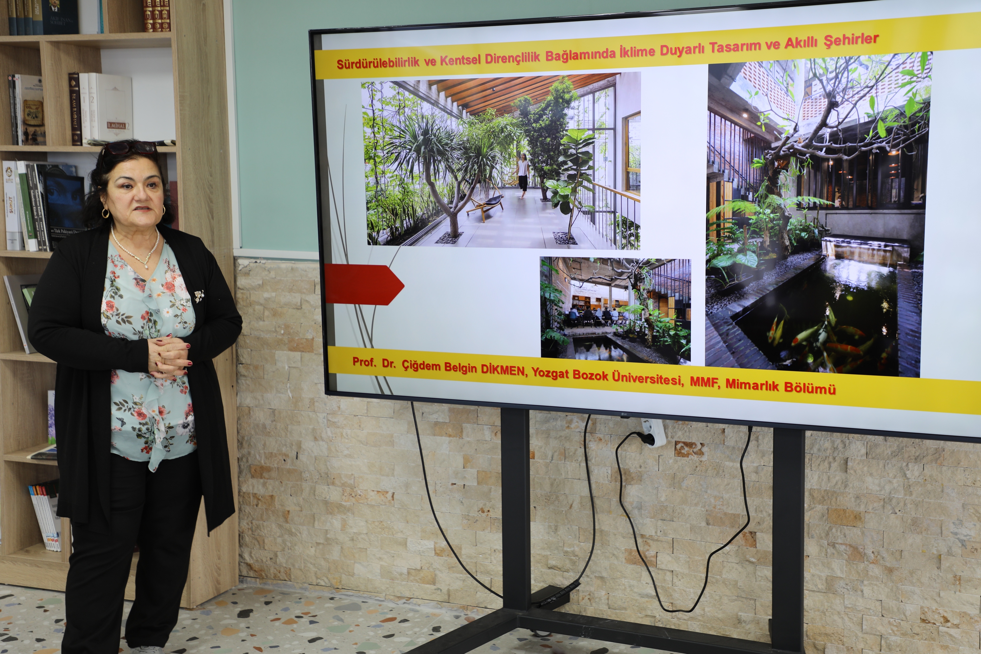 İklim Değişikliği ve Sıfır Atık Topluluğu Akademik Danışmanı Prof. Dr. Serpil Savcı’nın moderatörlüğünü yaptığı etkinlikte, Mühendislik Mimarlık Fakültesi Öğretim Üyesi Prof. Dr. Çiğdem Belgin Dikmen tarafından iklime duyarlı mimari tasarım ilkeleri, kentsel dirençlilik stratejileri ve akıllı şehir teknolojilerinin sürdürülebilirlik üzerindeki etkileri hakkında katılımcılara bilgiler aktarıldı.