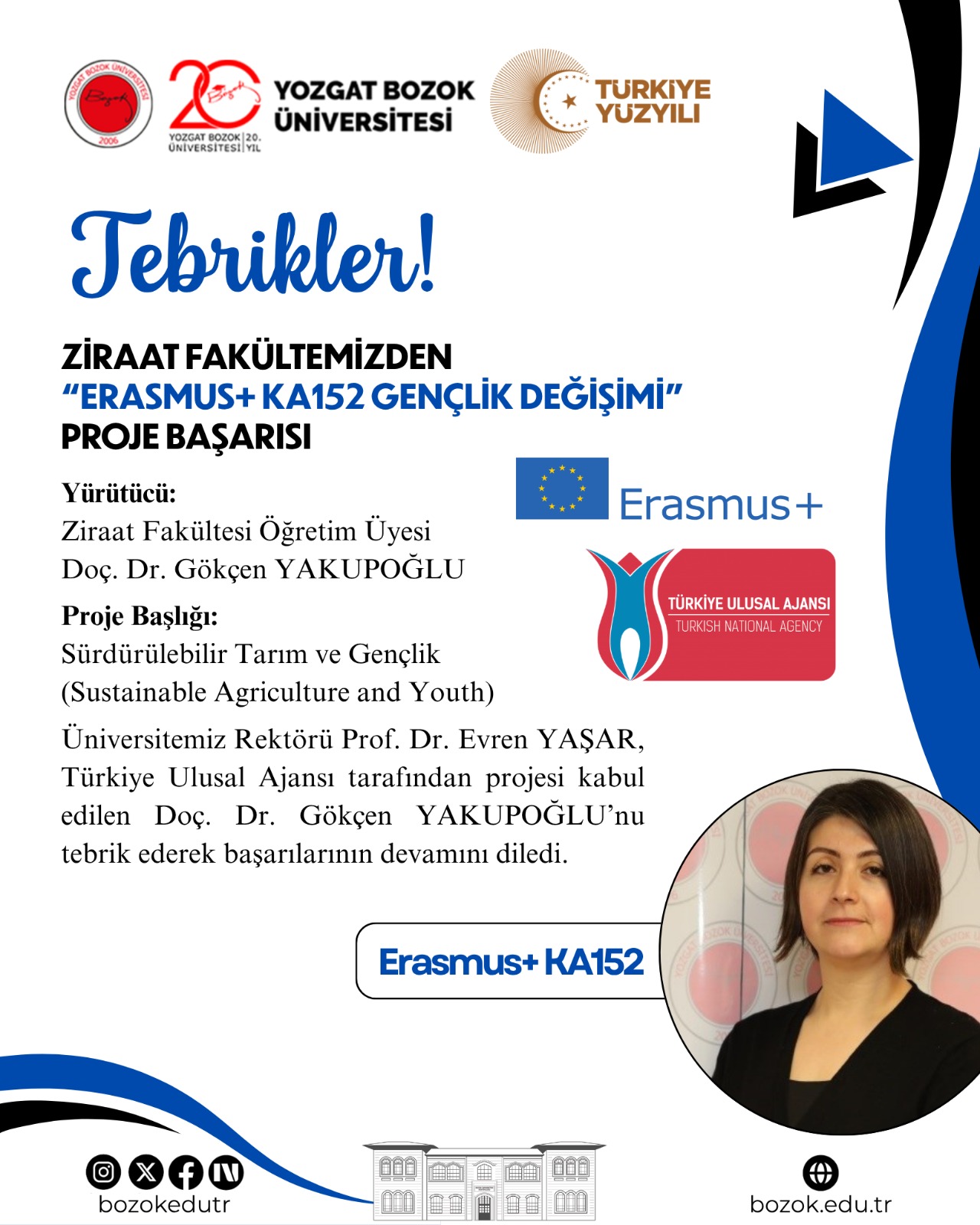 Ziraat Fakültesi Öğretim Üyesi Doç. Dr. Gökçen Yakupoğlu’nun yürütücülüğünü üstlendiği “Sürdürülebilir Tarım ve Gençlik (Sustainable Agriculture and Youth)” başlıklı Erasmus+ KA152 Gençlik Değişimi projesi, Türkiye Ulusal Ajansı tarafından desteklenmeye hak kazandı.