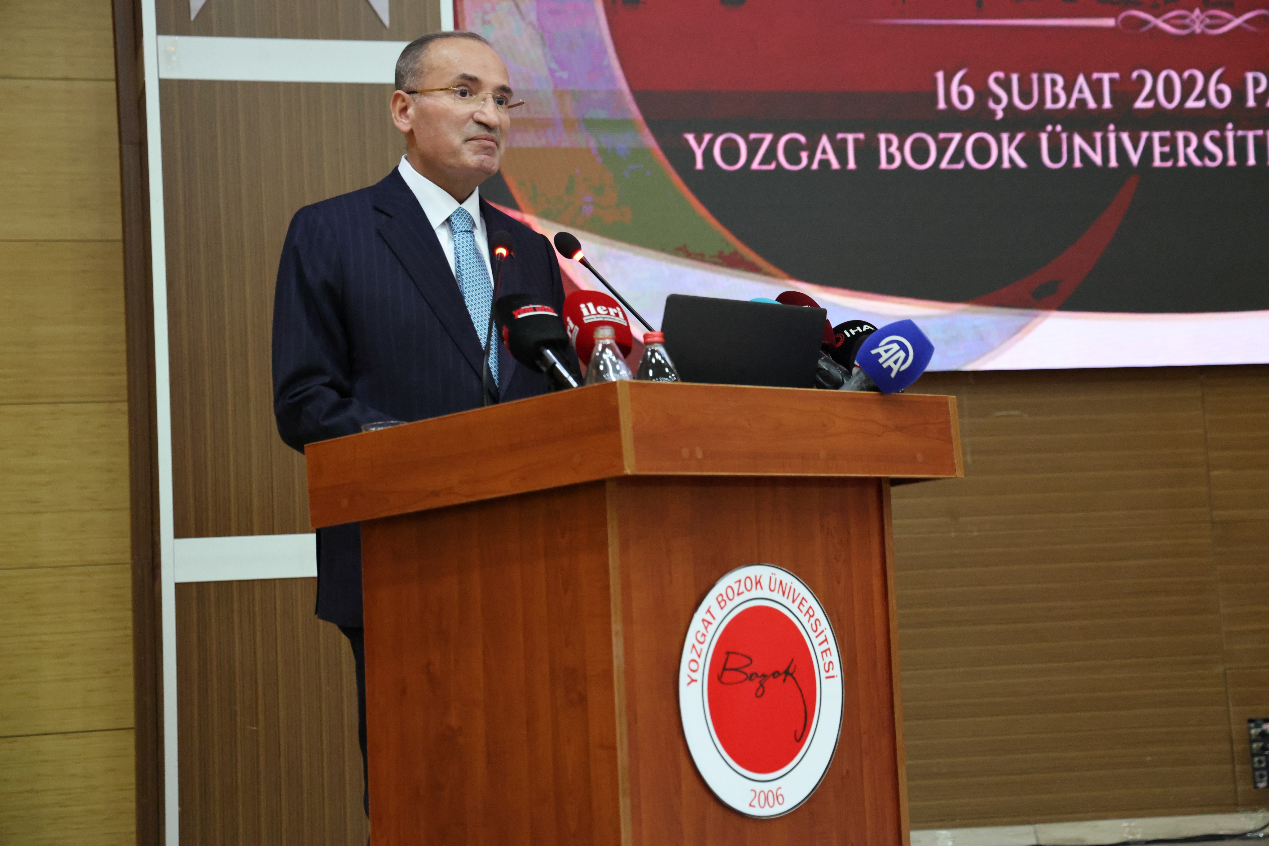 Programda konuşan Üniversitemiz Rektörü Prof. Dr. Evren Yaşar, “Topluma ve devlete uzun yıllar boyunca farklı görevlerde hizmet etmiş, hukuk ve siyaset alanında önemli sorumluluklar üstlenmiş Sayın Bekir Bozdağ’a fahri doktora ünvanını tevcih etmek üzere bir aradayız. Fahri doktora yalnızca akademik bir ünvan değil, aynı zamanda toplumun gelişimine, adalet anlayışına ve kamu hizmetine yapılan katkıların üniversite hafızasında anlam bulmasıdır. Sayın Bozdağ, üstlendiği görevlerde hukukun üstünlüğünü, demokratik değerleri ve kamu yararını önceleyen yaklaşımıyla ülkemizin yönetim ve hukuk hayatına önemli katkılar sunmuştur. Üniversiteler bilgi üreten, eleştiren ve aynı zamanda toplumsal hafızayı oluşturan kurumlardır. Bu çerçevede, farklı alanlarda ülkesine hizmet etmiş isimleri onurlandırmak, genç kuşaklara ilham verecek örnekleri görünür kılmak da akademinin sorumlulukları arasındadır. Bugün tevdi ettiğimiz bu unvanın, üniversitemiz ile kamu yönetimi arasındaki bilgi ve tecrübe köprülerini güçlendireceğine; öğrencilerimiz için ise kamu hizmetine adanmış bir yaşamın değerini hatırlatan anlamlı bir örnek olacağına inanıyorum. Bu vesileyle, Sayın Bakanım Bekir Bozdağ’a üniversitemiz adına hoş geldiniz diyor; kendilerini fahri doktora unvanı ile onurlandırmaktan duyduğumuz memnuniyeti ifade ediyor, saygılarımı sunuyorum.” dedi.