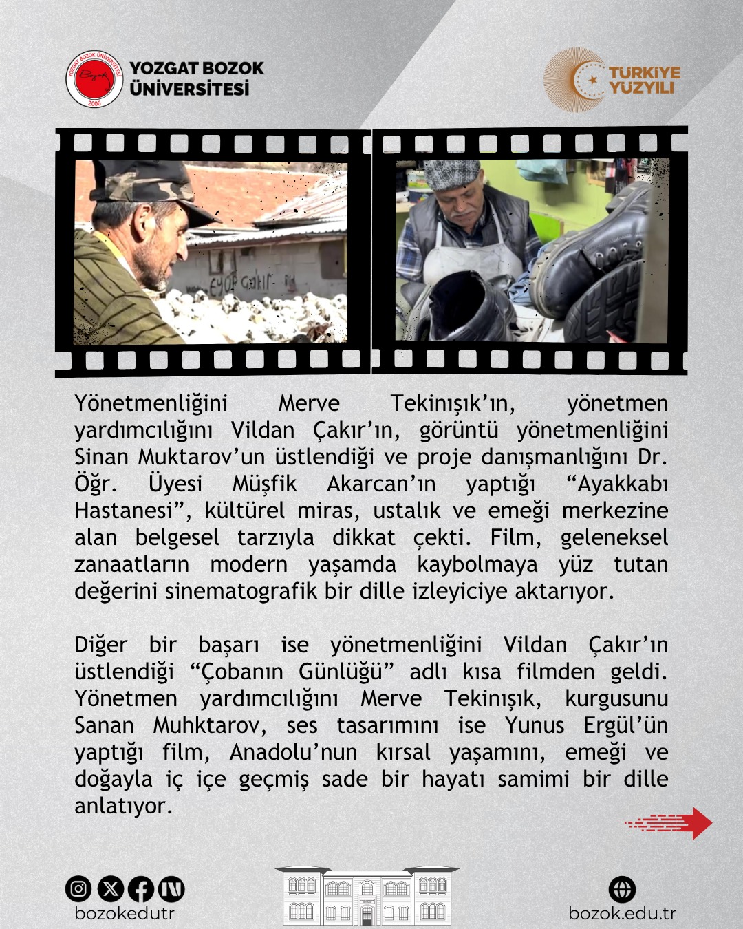 Yönetmenliğini Merve Tekinışık’ın, yönetmen yardımcılığını Vildan Çakır’ın, görüntü yönetmenliğini Sinan Muktarov’un üstlendiği ve proje danışmanlığını Dr. Öğr. Üyesi Müşfik Akarcan’ın yaptığı “Ayakkabı Hastanesi”, kültürel miras, ustalık ve emeği merkezine alan belgesel tarzıyla dikkat çekti. Film, geleneksel zanaatların modern yaşamda kaybolmaya yüz tutan değerini sinematografik bir dille izleyiciye aktarıyor.