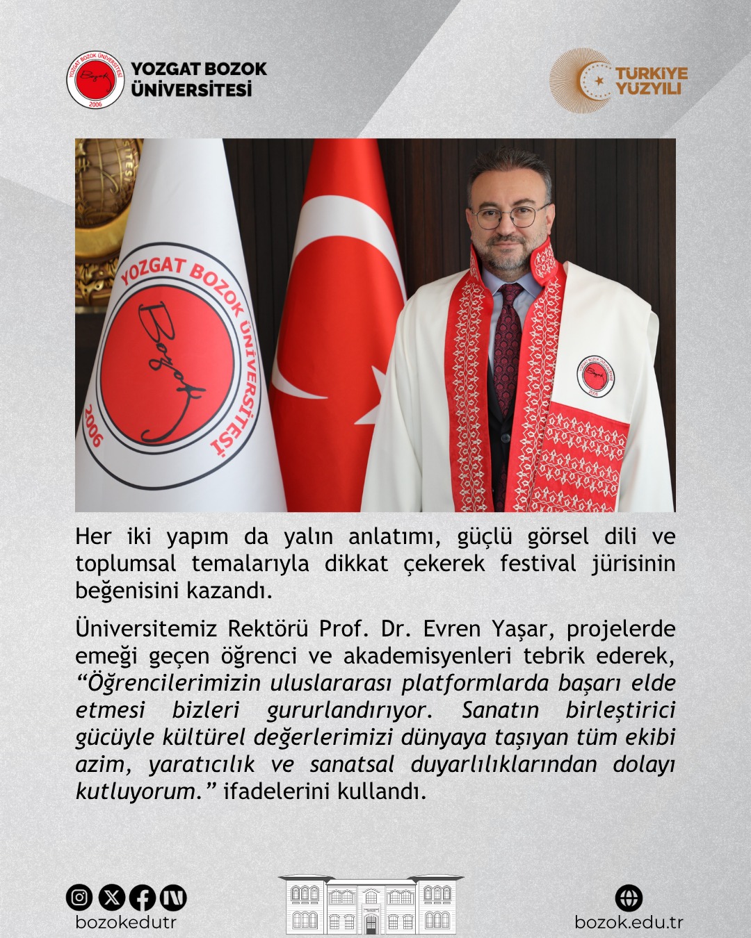 Üniversitemiz Rektörü Prof. Dr. Evren Yaşar, projelerde emeği geçen öğrenci ve akademisyenleri tebrik ederek, “Öğrencilerimizin uluslararası platformlarda başarı elde etmesi bizleri gururlandırıyor. Sanatın birleştirici gücüyle kültürel değerlerimizi dünyaya taşıyan tüm ekibi azim, yaratıcılık ve sanatsal duyarlılıklarından dolayı kutluyorum.” ifadelerini kullandı.