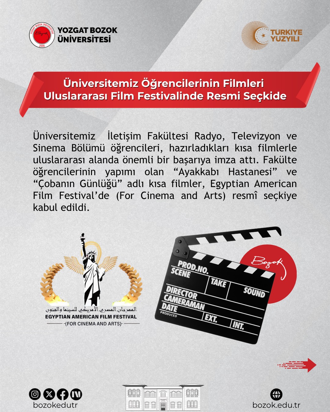 Üniversitemiz İletişim Fakültesi Radyo, Televizyon ve Sinema Bölümü öğrencileri, hazırladıkları kısa filmlerle uluslararası alanda önemli bir başarıya imza attı. Fakülte öğrencilerinin yapımı olan “Ayakkabı Hastanesi” ve “Çobanın Günlüğü” adlı kısa filmler, Egyptian American Film Festival’inde (For Cinema and Arts) resmî seçkiye kabul edildi.