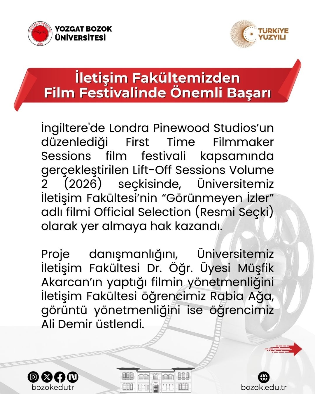 İngiltere'de Londra Pinewood Studios’un düzenlediği First Time Filmmaker Sessions film festivali kapsamında gerçekleştirilen Lift-Off Sessions Volume 2 (2026) seçkisinde, Üniversitemiz İletişim Fakültesi’nin “Görünmeyen İzler” adlı filmi Official Selection (Resmi Seçki) olarak yer almaya hak kazandı.