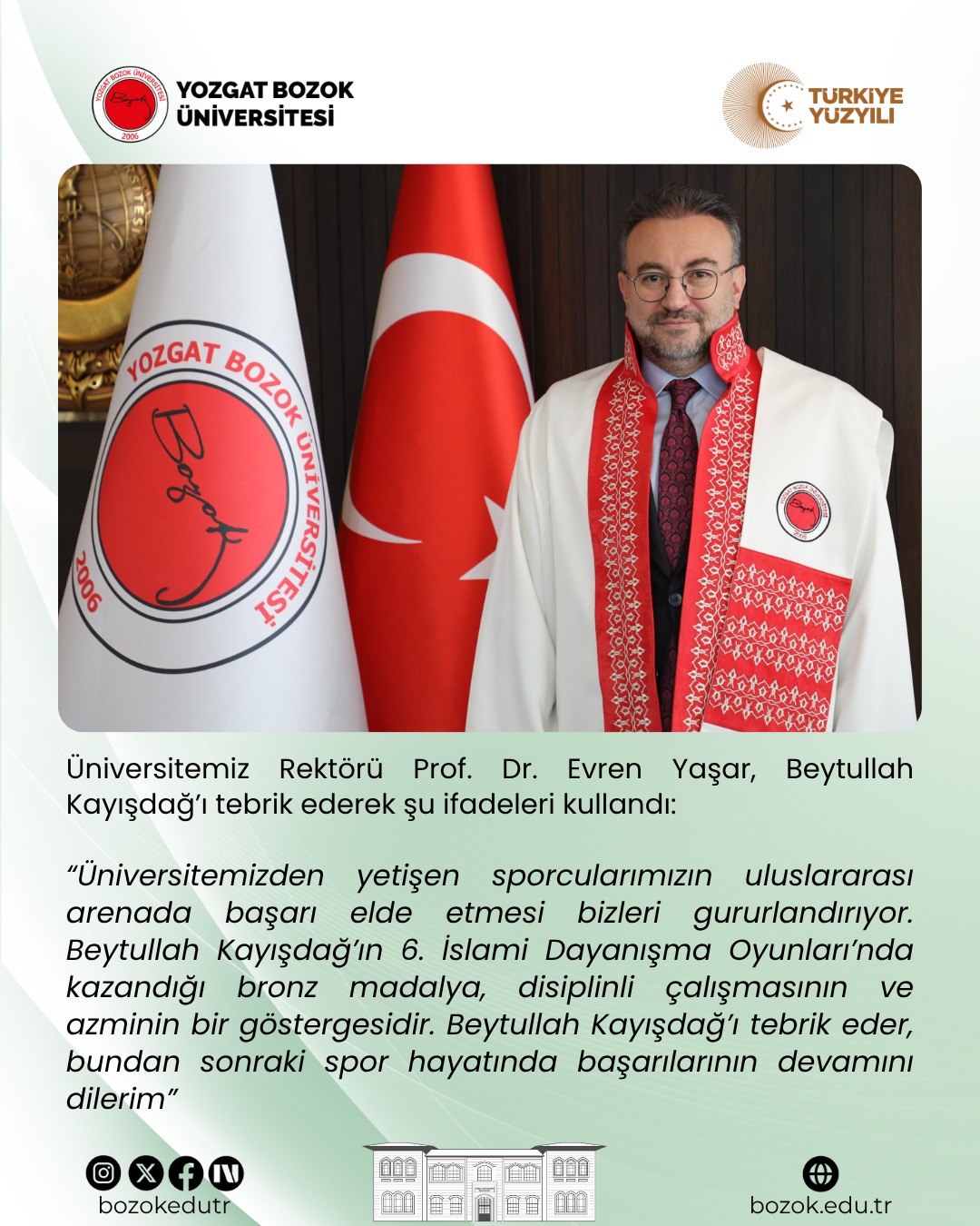 “Üniversitemizden yetişen sporcularımızın uluslararası arenada başarı elde etmesi bizleri gururlandırıyor. Beytullah Kayışdağ’ın 6. İslami Dayanışma Oyunları’nda kazandığı bronz madalya, disiplinli çalışmasının ve azminin bir göstergesidir. Beytullah Kayışdağ’ı tebrik eder, bundan sonraki spor hayatında başarılarının devamını dilerim”.