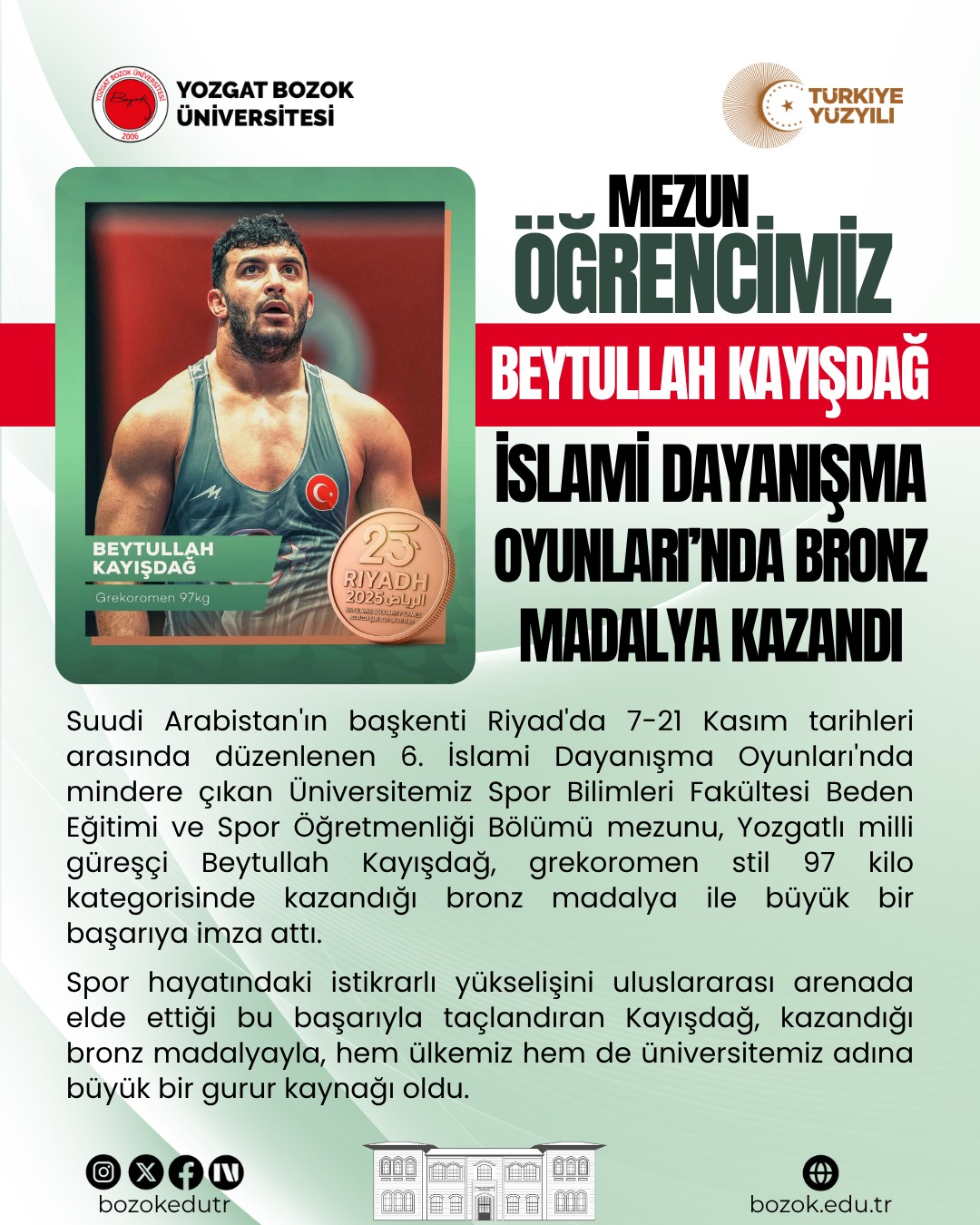 Suudi Arabistan'ın başkenti Riyad'da 7-21 Kasım tarihleri arasında düzenlenen 6. İslami Dayanışma Oyunları'nda mindere çıkan Üniversitemiz Spor Bilimleri Fakültesi Beden Eğitimi ve Spor Öğretmenliği Bölümü mezunu, Yozgatlı milli güreşçi Beytullah Kayışdağ, grekoromen stil 97 kilo kategorisinde kazandığı bronz madalya ile büyük bir başarıya imza attı.