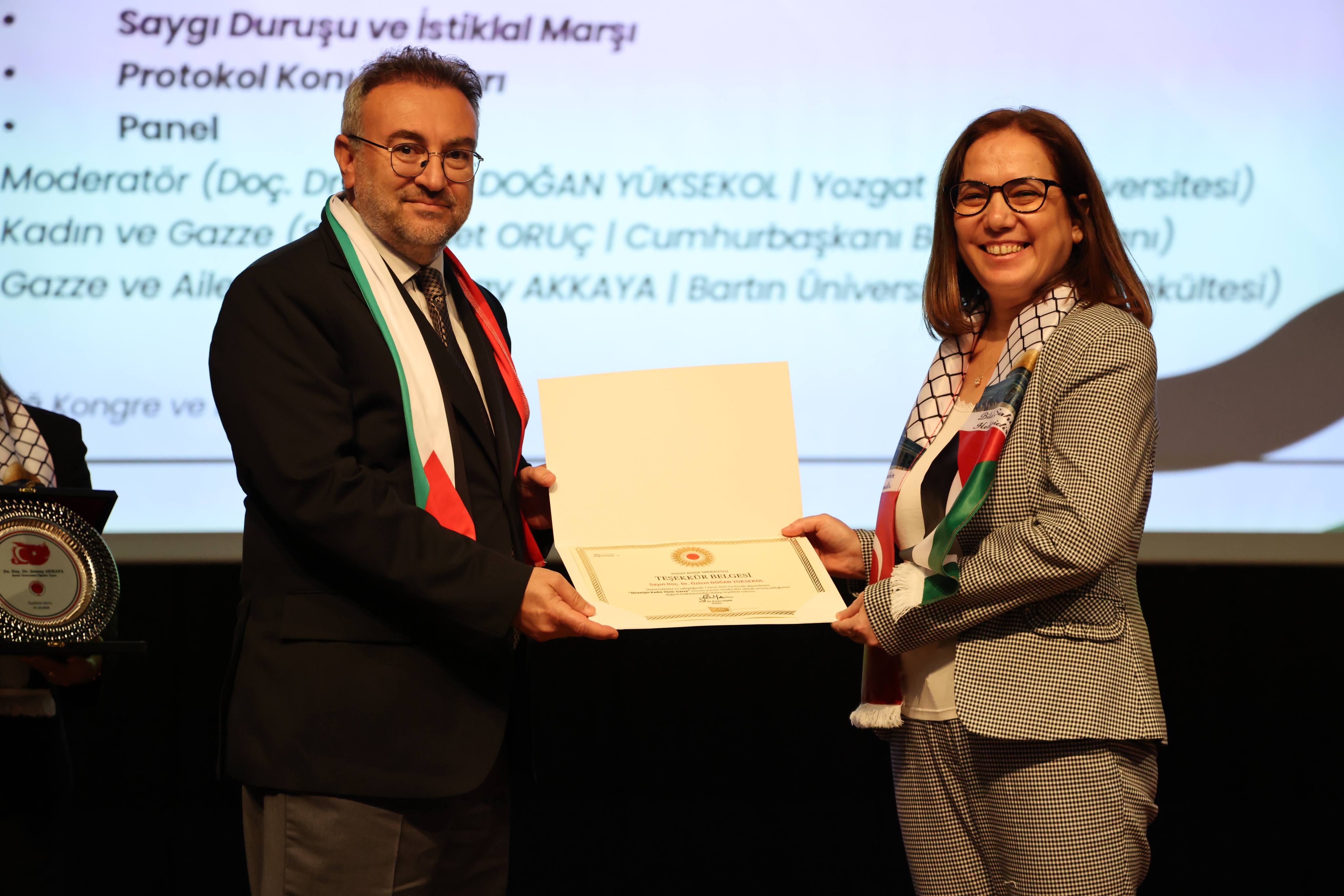 Üniversitemiz Rektörü Prof. Dr. Evren Yaşar da yaptığı konuşmasında üniversitelerin yalnızca bilgi üretmekle değil, aynı zamanda insanlık onurunun savunmakla da yükümlü olduğunu söyledi. Bilimin ancak vicdanla birleştiğinde anlam taşıdığını ifade eden Rektörümüz konuşmasının devamında şunları söyledi: “Bugün burada bilimin, aklın ve vicdanın çatısı altında bir araya gelirken, dünyanın bir köşesinde insanlığın vicdanını derinden yaralayan bir trajedinin tanıklarıyız. Gazze’de, her gün yeniden yazılan bir insanlık dramı yaşanıyor. Gökyüzü, çocuk çığlıklarıyla yankılanıyor; enkaz altında kalan bir oyuncak, bir annenin son dokunuşuyla sönmüş bir umut, insanlığın sessiz tanığına dönüşüyor. Bu çağda, bilgiyle, teknolojiyle, medeniyetle övünen insanlık; çocukların süt bulamadığı, annelerin evlatlarının cansız bedenine sarıldığı bir dünyanın utancını yaşıyor. En temel insani değer olan yaşama hakkı ayaklar altına alınırken, yardım eli uzatmaya çalışan insani kuruluşlar engelleniyor, vicdanın sesi susturulmak isteniyor. Sessiz kalmak, bu zulme ortak olmak demektir. Bugün, Gazze’de her bir yıkık duvar, insanlığın ahlakî çöküşünü yansıtıyor; ama aynı zamanda bir vicdan çağrısı da yapıyor bizlere: “Susma!” O nedenle biz, Yozgat Bozok Üniversitesi ve Bartın Üniversitesi olarak, çocukların öldürülmediği, annelerin ağlamadığı, adaletin ve merhametin yeniden hüküm sürdüğü bir dünya için söz veriyoruz. Bilimin, insanlığın ve vicdanın sesi olarak, mazlumun yanında olmayı sürdüreceğiz. Gazze’de yaşamını yitiren tüm masumları rahmetle, insanlığın kaybolmayan vicdanını ise umutla anıyorum. Unutmayalım: Bir çocuğun gözyaşı, bütün dünyanın susmasını gerektirecek kadar büyük bir hakikattir”.