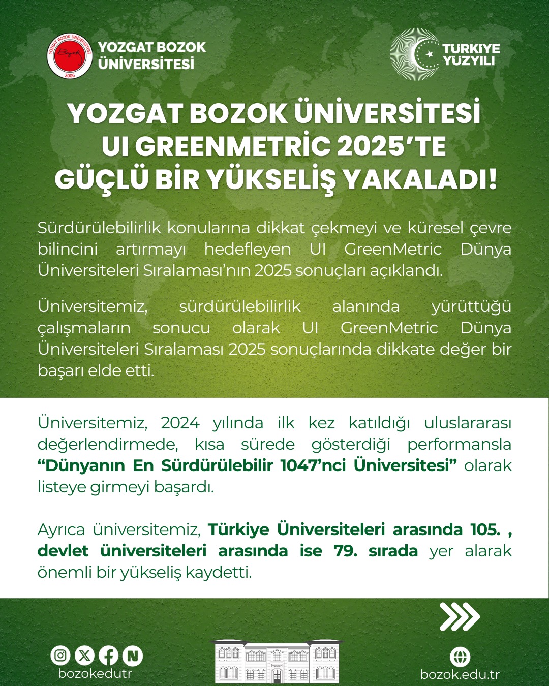 Yozgat Bozok Üniversitesi UI Greenmetric 2025’te Güçlü Bir Yükseliş Yakaladı!