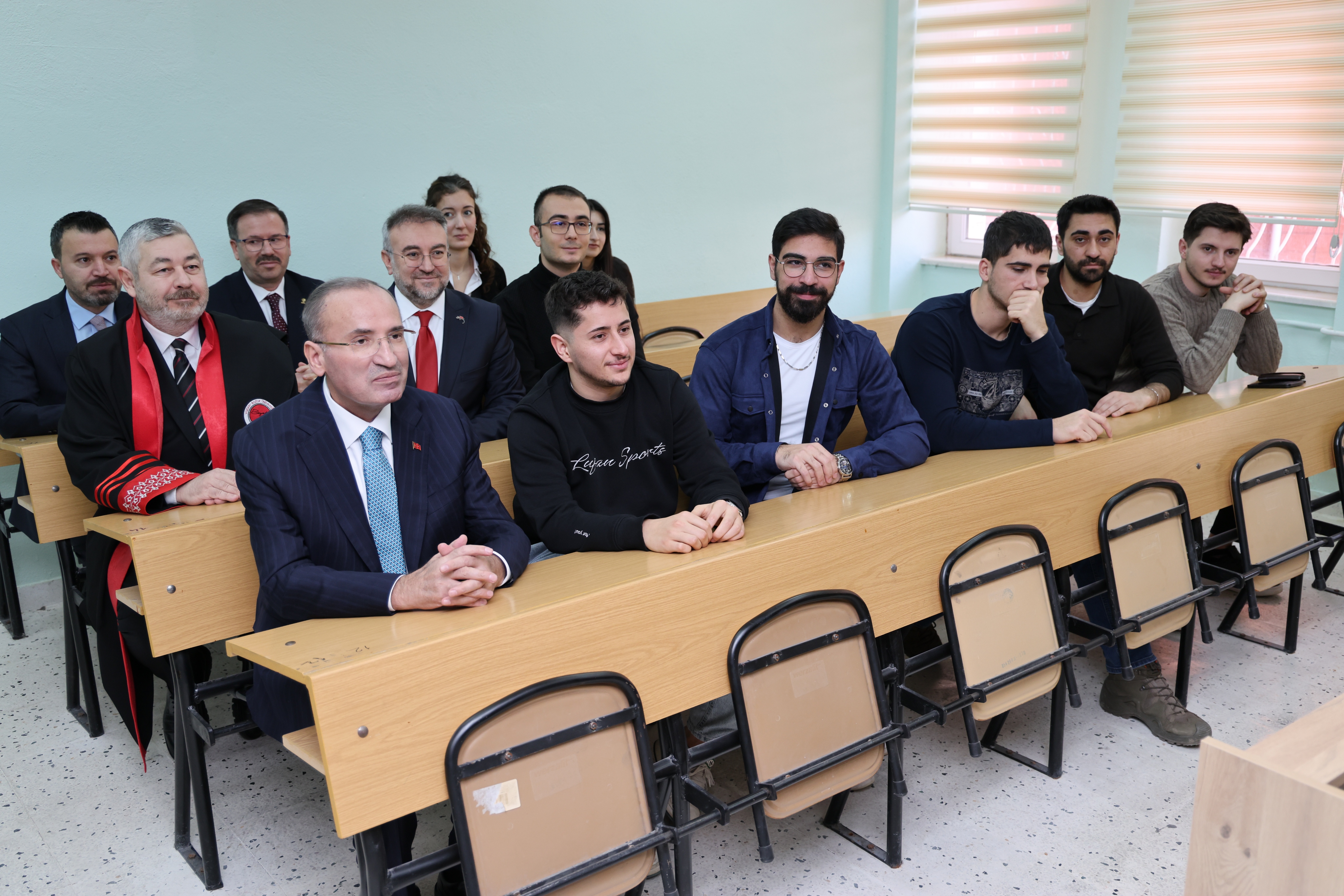 Hukuk Fakültesi Kütüphanesi ile Uygulama Mahkeme Salonu’nda incelemelerde bulunan Türkiye Büyük Millet Meclisi (TBMM) Başkanvekili Bekir Bozdağ, Üniversitemiz Hukuk Fakültesi öğrencileriyle bir araya gelerek sohbet etti. Öğrencilerin sorularını yanıtlayan Bozdağ, mesleki deneyimlerini paylaştı ve genç hukukçulara tavsiyelerde bulundu.