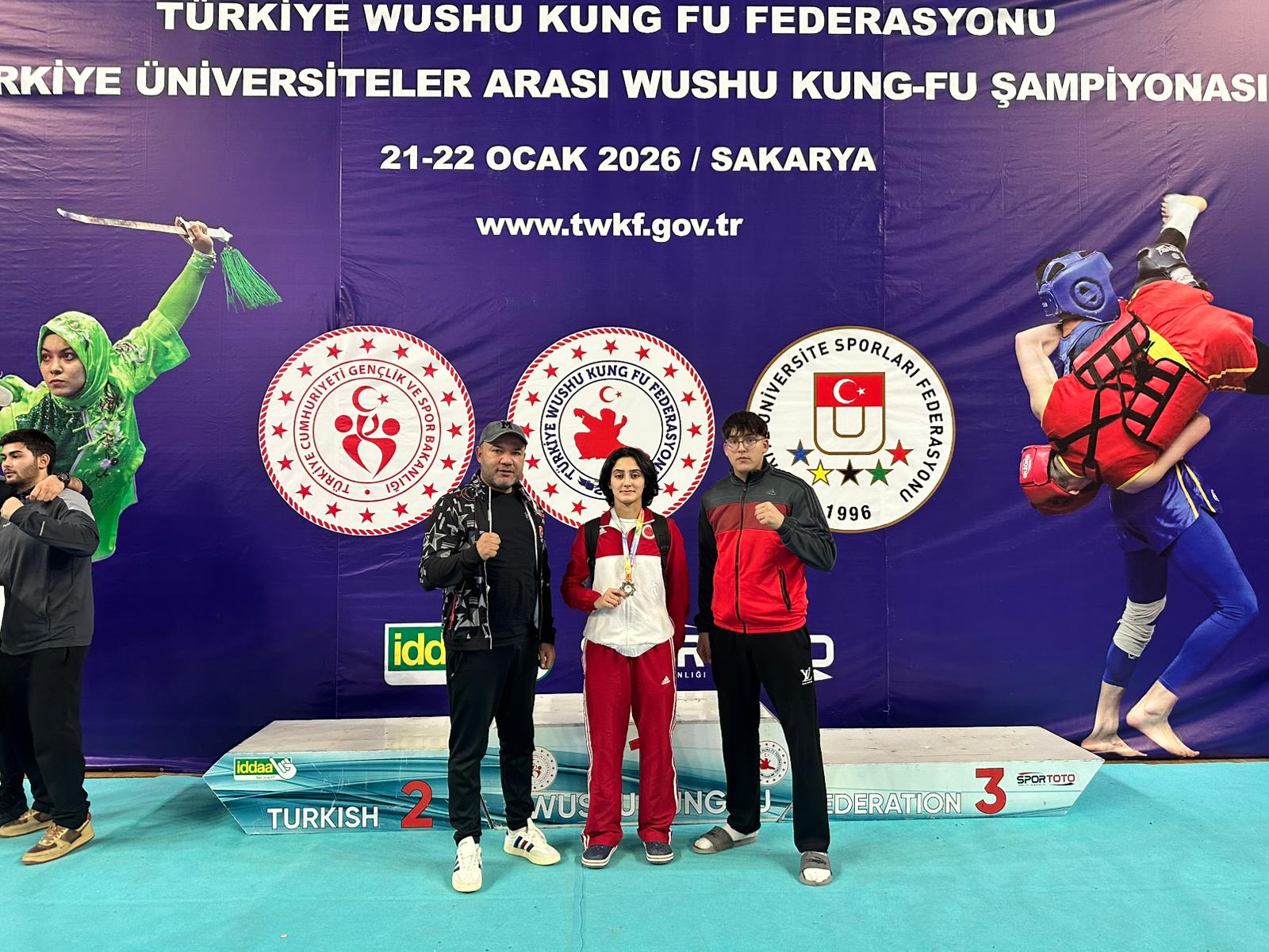 Üniversitemiz Spor Bilimleri Fakültesi Antrenörlük Eğitimi 1. sınıf öğrencisi Yağmur Efetürk, 21-22 Ocak tarihleri arasında Türkiye Wushu Kung Fu Federasyonu ve Türkiye Üniversite Sporları Federasyonu tarafından Sakarya’da düzenlenen Türkiye Üniversiteler Arası Wushu Kung-Fu Şampiyonası’nda önemli bir başarıya imza attı. 56 üniversiteden 216 sporcunun katıldığı şampiyonada öğrencimiz Efetürk, 56 kg Wushu Sanda kategorisinde Türkiye üçüncüsü oldu.