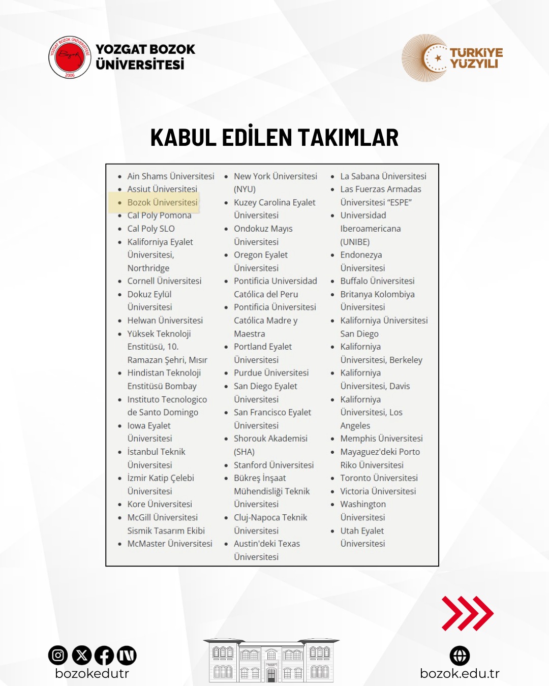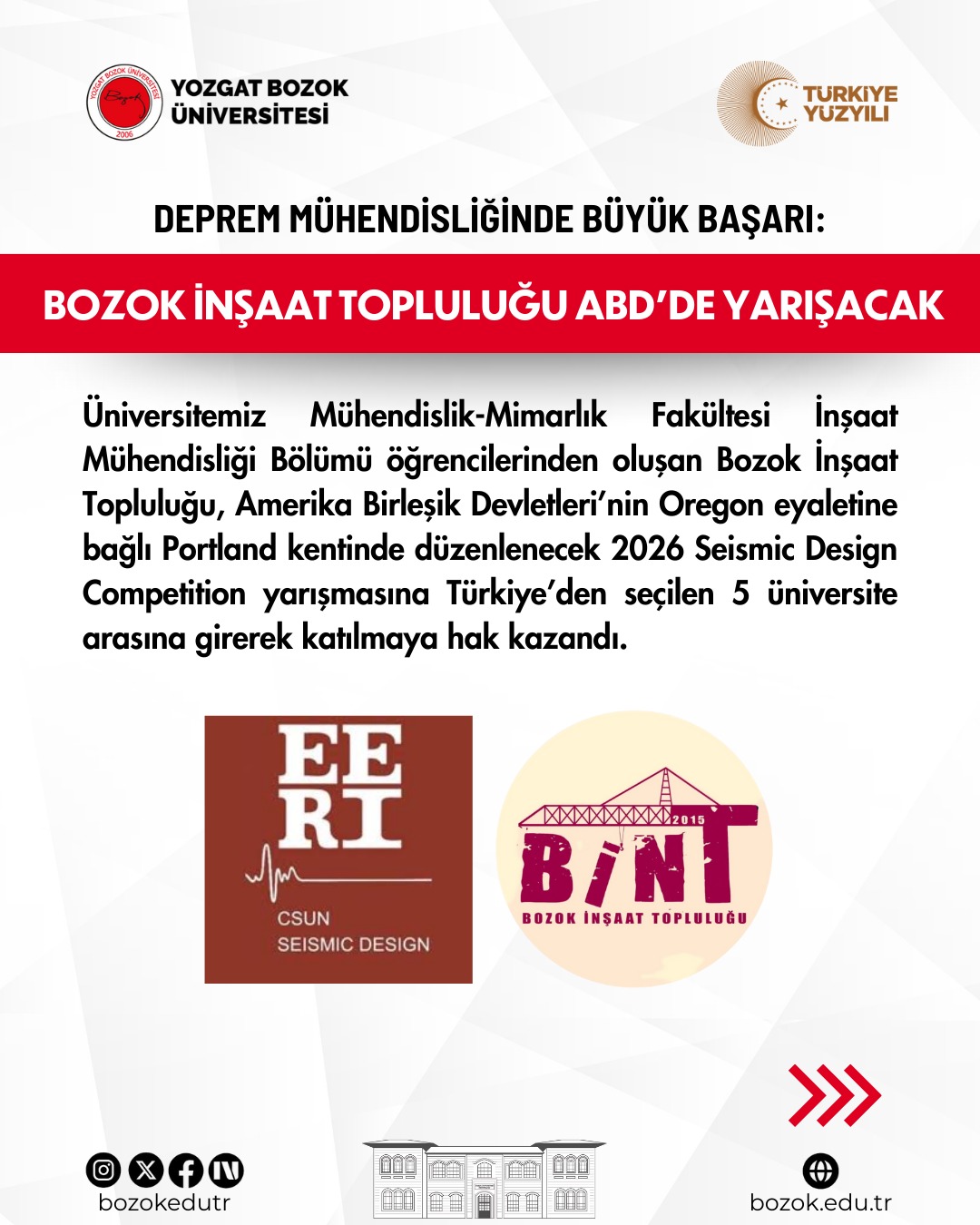 Üniversitemiz Mühendislik-Mimarlık Fakültesi İnşaat Mühendisliği Bölümü öğrencilerinden oluşan Bozok İnşaat Topluluğu, Amerika Birleşik Devletleri’nin Oregon eyaletine bağlı Portland kentinde düzenlenecek 2026 Seismic Design Competition yarışmasına Türkiye’den seçilen 5 üniversite arasına girerek katılmaya hak kazandı.