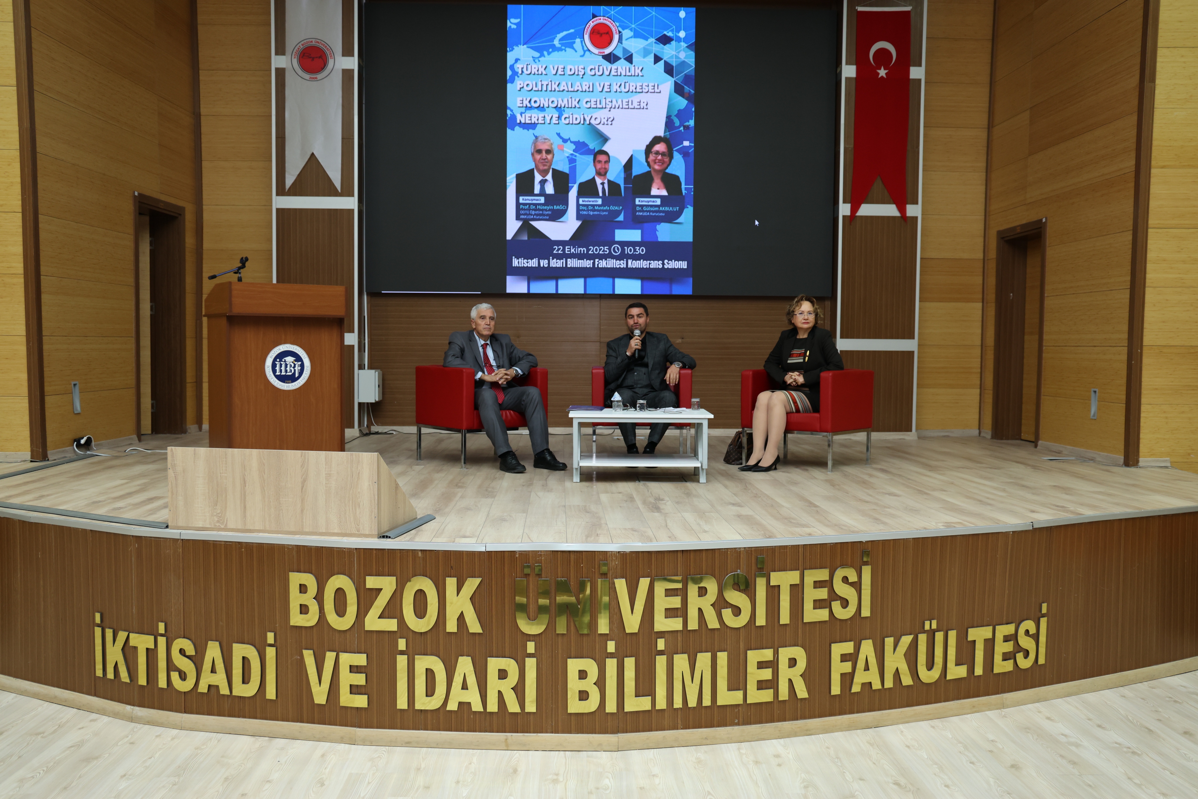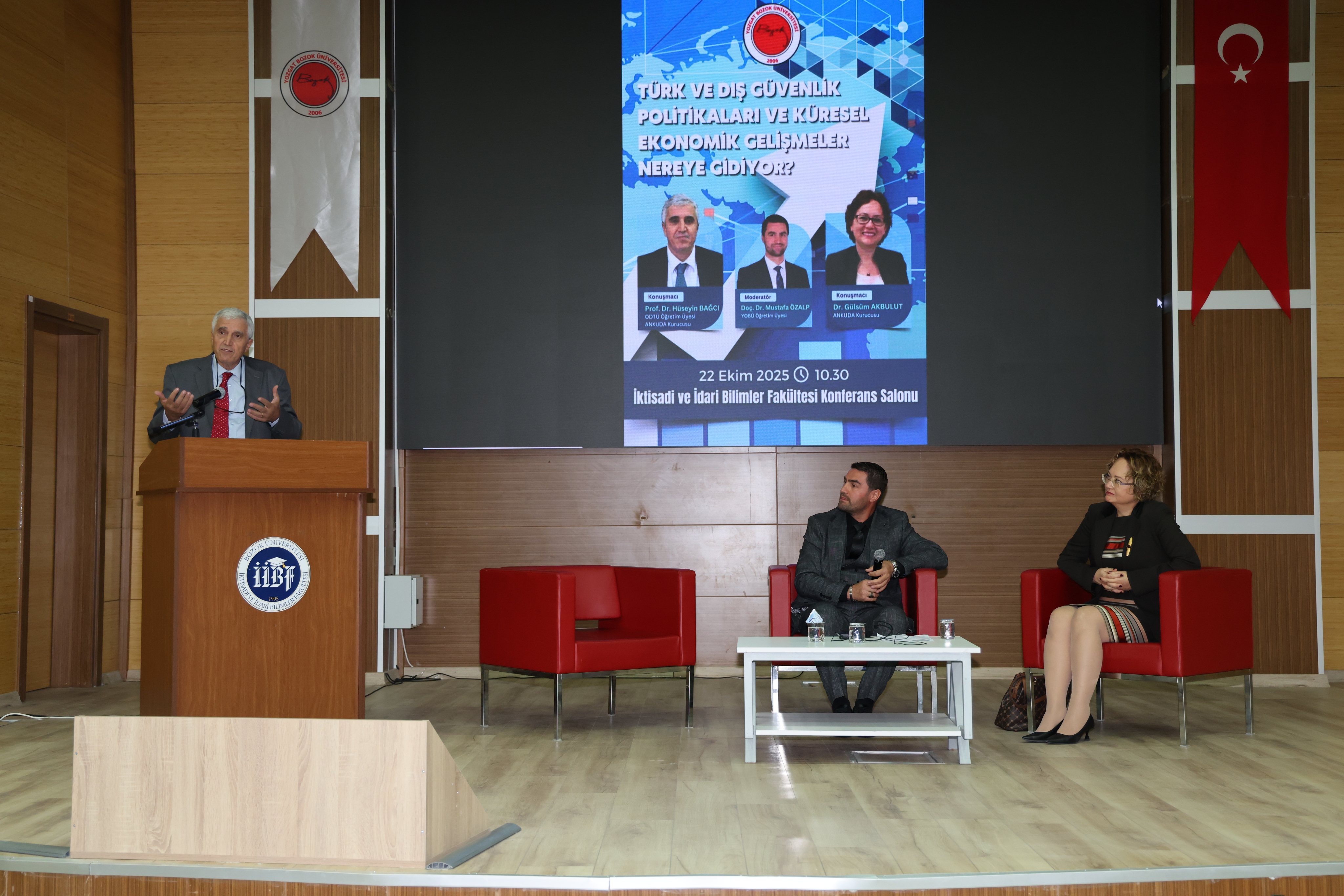 Üniversitemiz İktisadi ve İdari Bilimler Fakültesi (İİBF) tarafından öğrencilerin güncel siyasi, ekonomik ve güvenlik konularına ilişkin farkındalıklarını artırmak amacıyla “Türk ve Dış Güvenlik Politikaları ve Küresel Ekonomik Gelişmeler Nereye Gidiyor?” konulu panel düzenlendi.