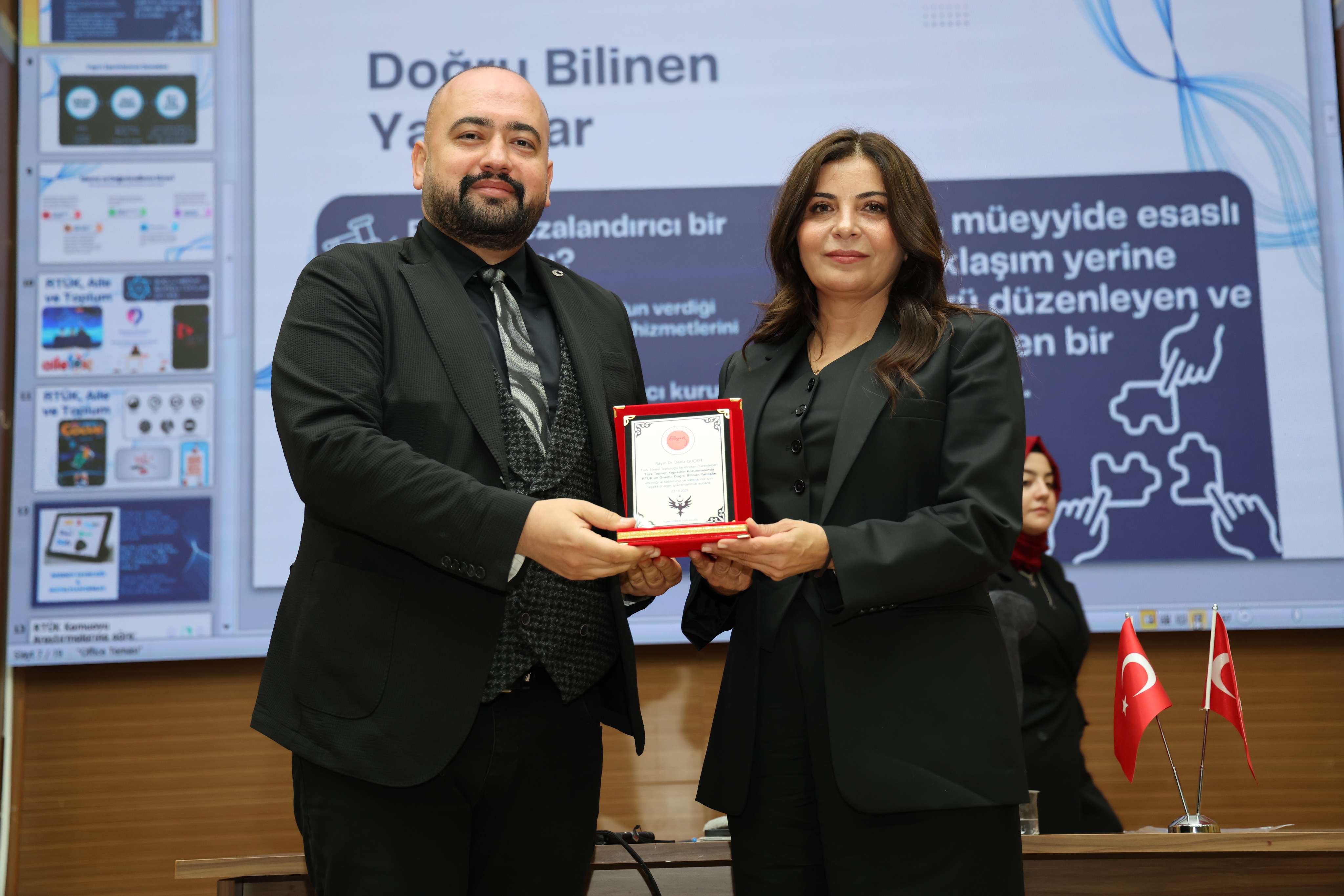 Konferansın sonunda Üniversitemiz Genel Sekreteri Doç. Dr. Mustafa Kocakaya, Radyo ve Televizyon Üst Kurulu (RTÜK) Üyesi Dr. Deniz Güçer’e günün anısına plaket takdim etti.