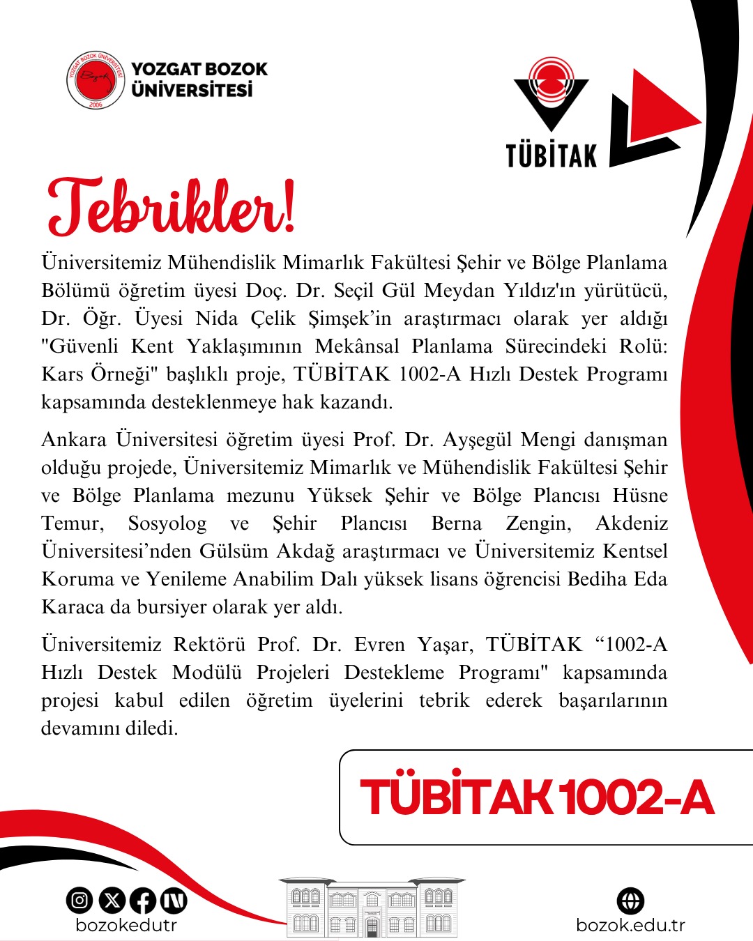 Üniversitemiz Mühendislik Mimarlık Fakültesi Şehir ve Bölge Planlama Bölümü öğretim üyesi Doç. Dr. Seçil Gül Meydan Yıldız'ın yürütücü, Dr. Öğr. Üyesi Nida Çelik Şimşek’in araştırmacı olarak yer aldığı "Güvenli Kent Yaklaşımının Mekânsal Planlama Sürecindeki Rolü: Kars Örneği" başlıklı proje, TÜBİTAK 1002-A Hızlı Destek Programı kapsamında desteklenmeye hak kazandı.