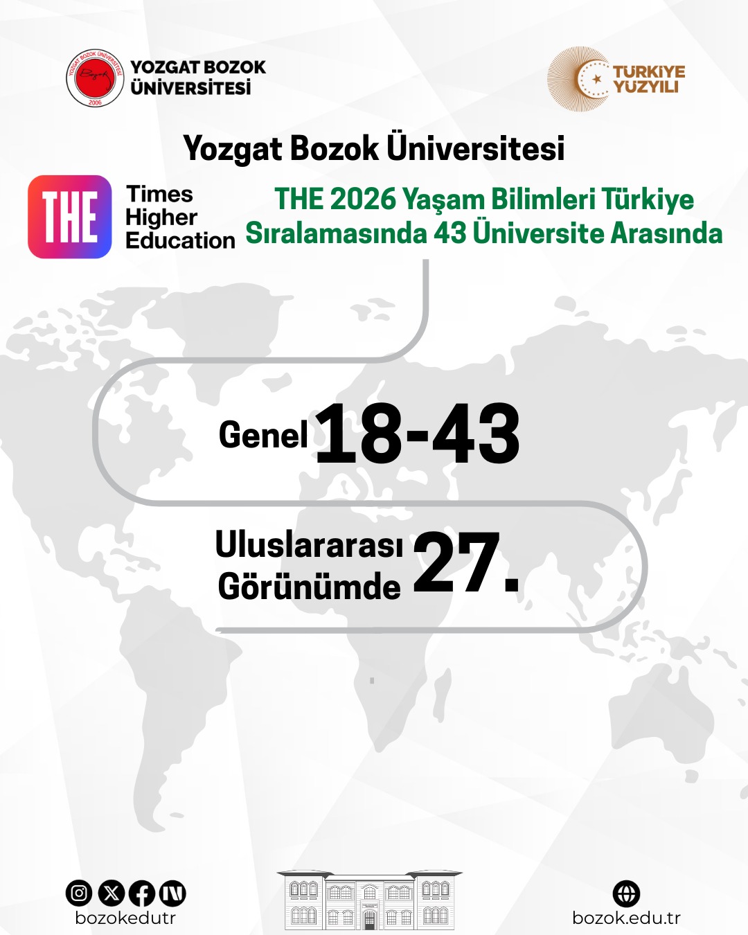 Yozgat Bozok Üniversitesi, Yaşam Bilimleri (Life Sciences) alanında ilk kez THE dünya sıralamasında yer alarak önemli bir akademik eşiği aşmış oldu. Biyoloji, tarım ve ormancılık gibi disiplinleri kapsayan bu alanda dünya genelinde 1211 üniversite değerlendirmeye alındı.