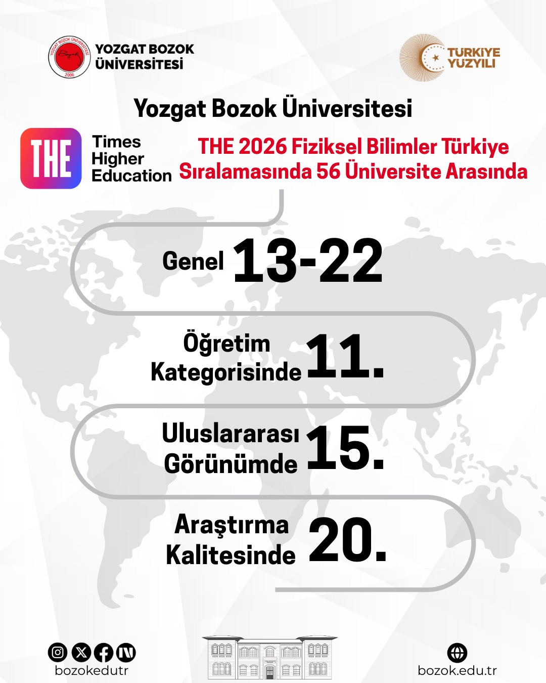 Yozgat Bozok Üniversitesi, Matematik, Fizik, Kimya ve Jeoloji gibi temel bilimleri kapsayan Fiziksel Bilimler (Physical Sciences) alanında sıralamadaki en yüksek performansını gösterdi. Dünya genelinde 109 ülkeden 1497 üniversitenin değerlendirildiği bu alanda Üniversitemiz, 801–1000 bandında yer alarak Türkiye’nin önde gelen üniversiteleri arasında yer aldı.
