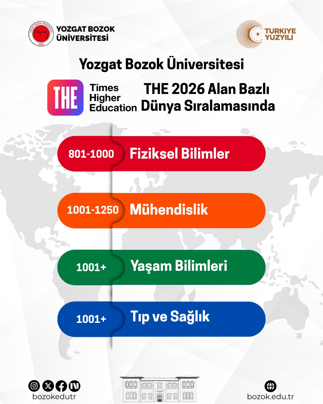 Dünyanın en prestijli akademik derecelendirme kuruluşlarından biri olan Times Higher Education (THE), Dünya Üniversite Sıralaması 2026 yılı sonuçlarını yayınladı.“2026 Dünya Üniversite Alan Sıralamaları” (World University Rankings by Subject) sonuçlarına göre Yozgat Bozok Üniversitesi, Fiziksel Bilimler, Mühendislik ve Teknoloji, Tıp ve Sağlık Bilimleri ile Yaşam Bilimleri olmak üzere dört farklı alanda dünya sıralamasına girme başarısı gösterdi.