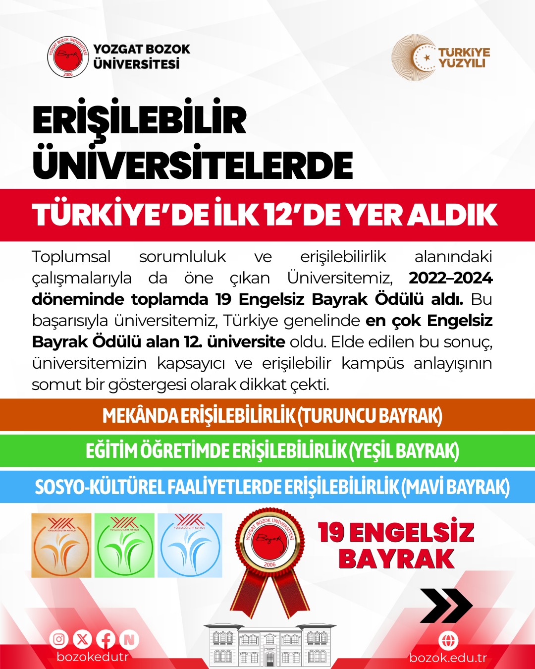 Toplumsal sorumluluk ve erişilebilirlik alanındaki çalışmalarıyla da öne çıkan Üniversitemiz, 2022–2024 döneminde toplamda 19 Engelsiz Bayrak Ödülü aldı. Bu başarısıyla üniversitemiz, Türkiye genelinde en çok Engelsiz Bayrak Ödülü alan 12. üniversite oldu. Elde edilen bu sonuç, üniversitemizin kapsayıcı ve erişilebilir kampüs anlayışının somut bir göstergesi olarak dikkat çekti.