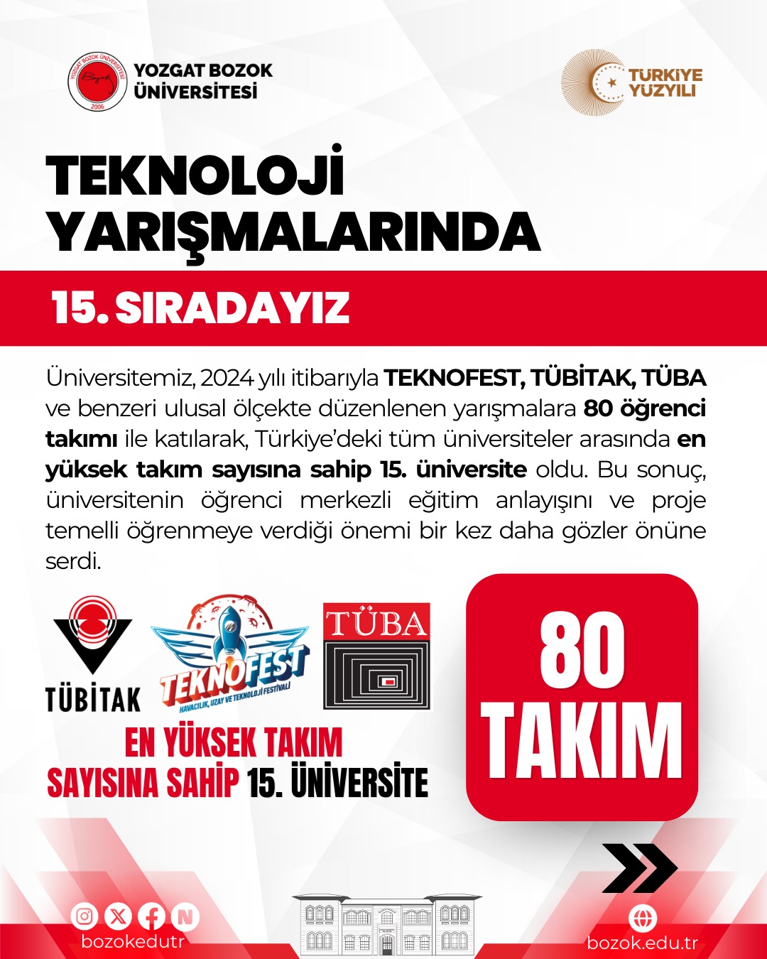 Üniversitemiz, 2024 yılı itibarıyla TEKNOFEST, TÜBİTAK, TÜBA ve benzeri ulusal ölçekte düzenlenen yarışmalara 80 öğrenci takımı ile katılarak, Türkiye’deki tüm üniversiteler arasında en yüksek takım sayısına sahip 15. üniversite oldu. Bu sonuç, üniversitenin öğrenci merkezli eğitim anlayışını ve proje temelli öğrenmeye verdiği önemi bir kez daha gözler önüne serdi.