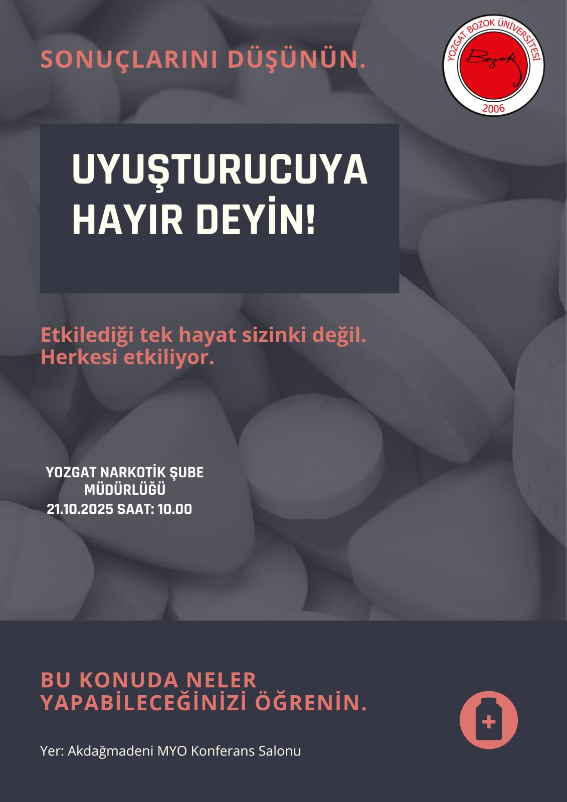 21.10.2025 tarihinde saat 10.00-11.00 arasında Meslek Yüksekokulmuz konferans salonumuzda öğrencilere yönelik Yozgat Emniyet Müdürlüğü Narkotik Şube tarafından uyuşturucu bağımlılıklar konusunda eğitim verilecektir.