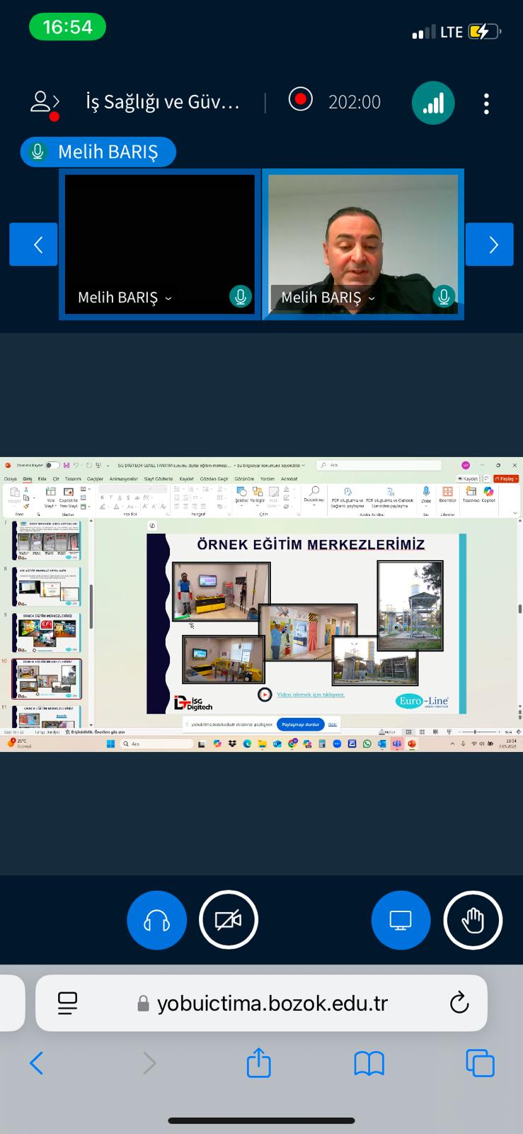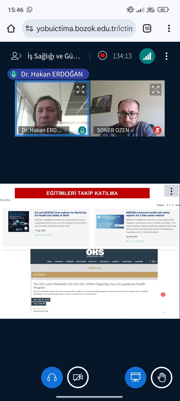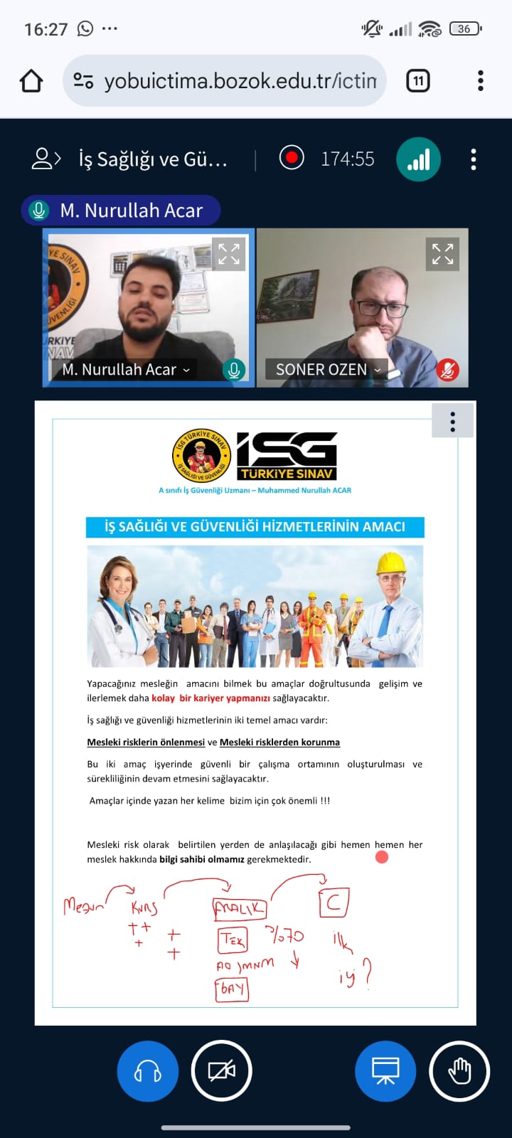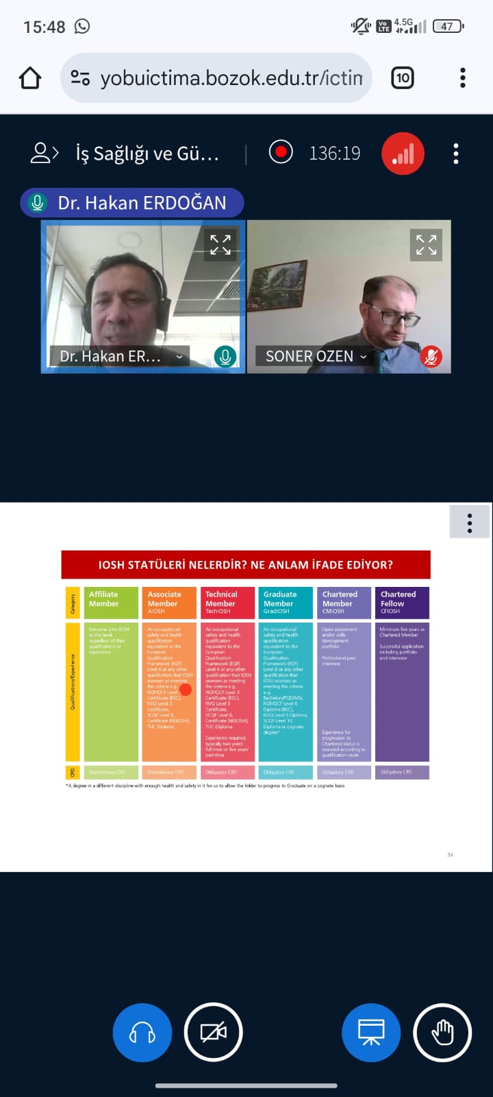 Yozgat Bozok Üniversitesi Öğrenme ve Öğretmeyi Geliştirme Araştırma ve Uygulama Merkezi (YÖGEM) iş birliğiyle 25.12.2024 tarihinde Lisans öğrencilerine yönelik faaliyet kapsamında "Sürdürülebilir Kalkınma Hedefleri Doğrultusunda İş Sağlığı ve Güvenliği Uygulamaları" konferansı emekli İSO 45001:2018 Baş denetçisi ve A sınıfı İGU Alişan ALBAYRAK tarafından çevirmiçi (online) olarak ictima üzerinden gerçekleştirilmiştir. Konferans süresince mevcut iş sağlığı ve güvenliği uygulamaları, sürdürülebilir iş sağlığı ve güvenliği uygulamaları, iş güvenliği uzmanlarının karşılaştıkları sorunlar, sürdürülebilirliğe ilişkin çözüm önerileri gibi konularda bilgiler sunulmuştur. Ayrıca bilgilendirme sunumu sonrası öğrencilerimizin katılımı ile soru-cevap bölümünde öğrencilerimizin beklentilerine yönelik faydalı bir sohbette gerçekleştirilmiştir. Etkinlik sonrası öğrencilerimiz memnuniyetlerini dile getirerek etkinliğin düzenlenmesinde emeği geçen herkese teşekkürlerini iletmişlerdir.