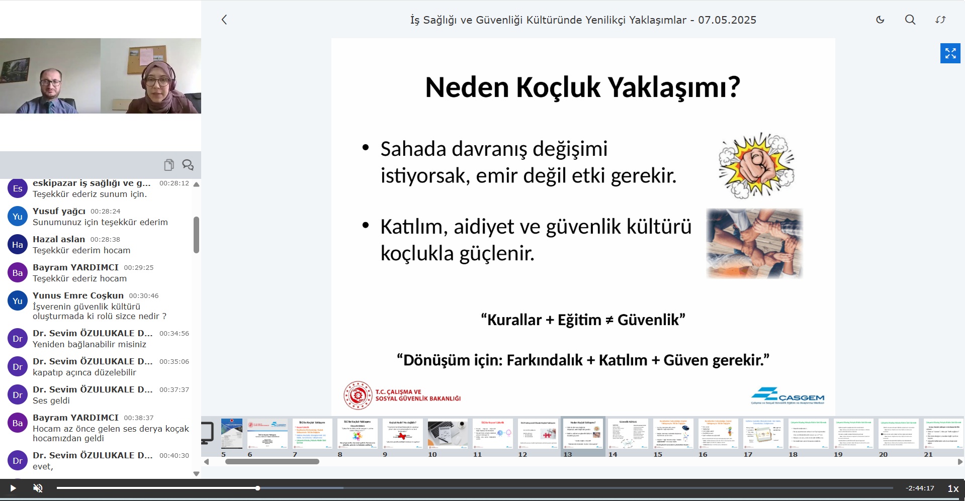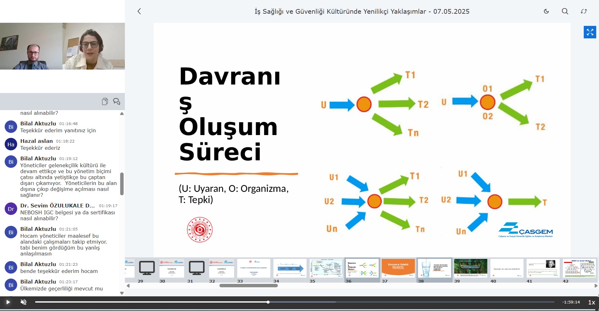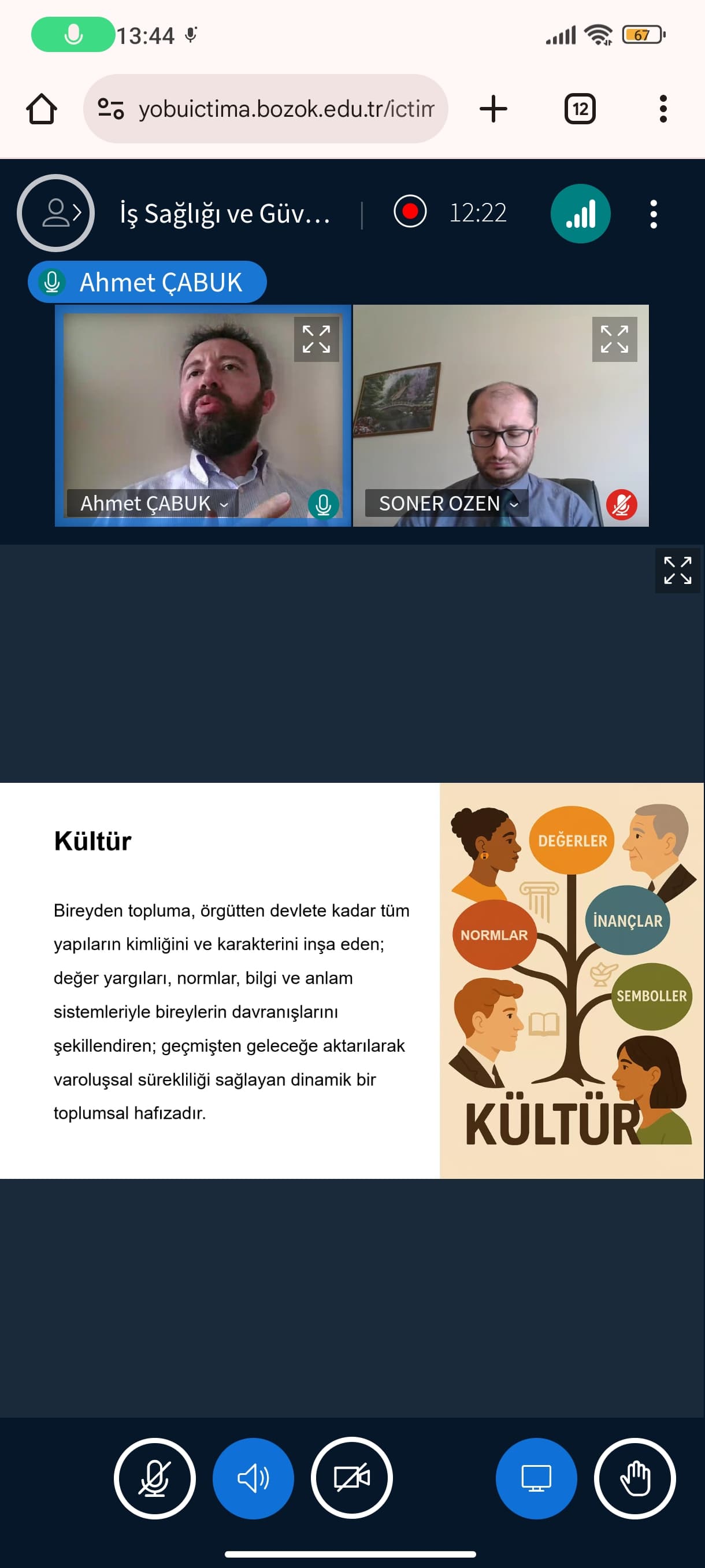 Yozgat Bozok Üniversitesi Öğrenme ve Öğretmeyi Geliştirme Araştırma ve Uygulama Merkezi (YÖGEM) iş birliğiyle 25.12.2024 tarihinde Lisans öğrencilerine yönelik faaliyet kapsamında "Sürdürülebilir Kalkınma Hedefleri Doğrultusunda İş Sağlığı ve Güvenliği Uygulamaları" konferansı emekli İSO 45001:2018 Baş denetçisi ve A sınıfı İGU Alişan ALBAYRAK tarafından çevirmiçi (online) olarak ictima üzerinden gerçekleştirilmiştir. Konferans süresince mevcut iş sağlığı ve güvenliği uygulamaları, sürdürülebilir iş sağlığı ve güvenliği uygulamaları, iş güvenliği uzmanlarının karşılaştıkları sorunlar, sürdürülebilirliğe ilişkin çözüm önerileri gibi konularda bilgiler sunulmuştur. Ayrıca bilgilendirme sunumu sonrası öğrencilerimizin katılımı ile soru-cevap bölümünde öğrencilerimizin beklentilerine yönelik faydalı bir sohbette gerçekleştirilmiştir. Etkinlik sonrası öğrencilerimiz memnuniyetlerini dile getirerek etkinliğin düzenlenmesinde emeği geçen herkese teşekkürlerini iletmişlerdir.