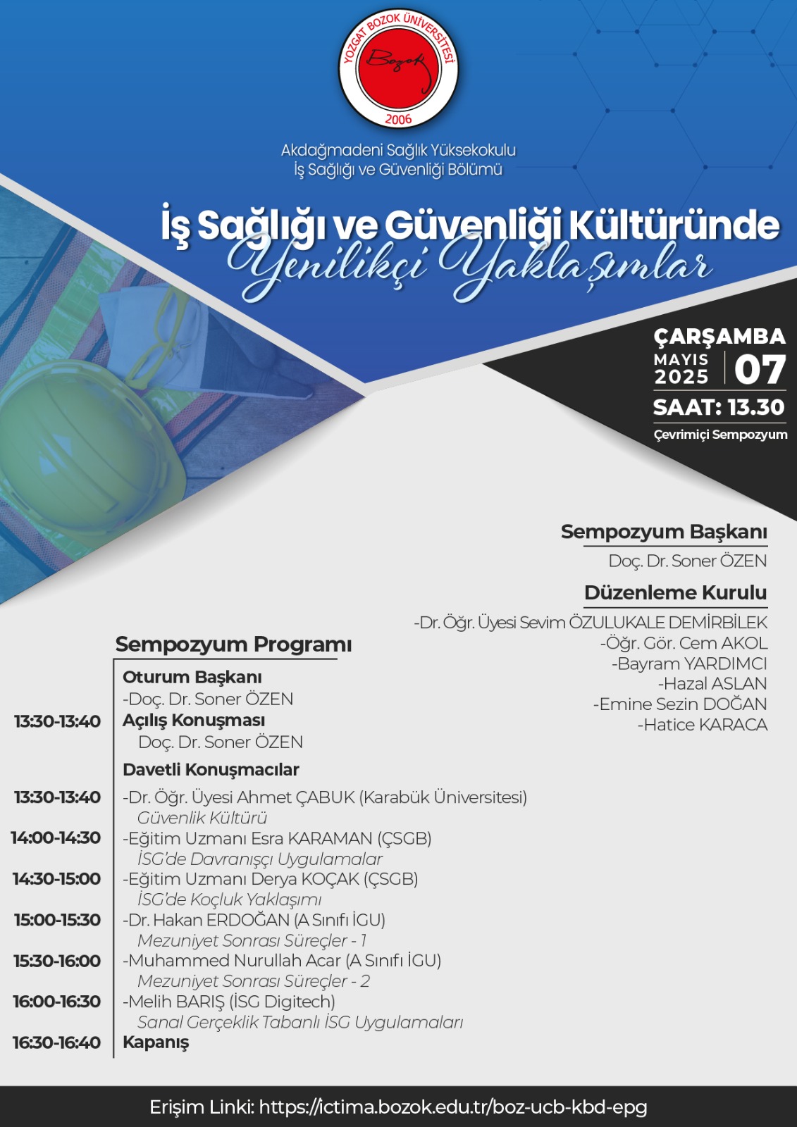 Yozgat Bozok Üniversitesi Akdağmadeni Sağlık Yüksekokulu İş Sağlığı ve Güvenliği bölümü olarak her yıl 04-10 Mayıs tarihleri arasında kutlanan İş Sağlığı ve Güvenliği haftası etkinliği kapsamında 07 Mayıs 2025 tarihinde çevrimiçi olarak yapılmış olan “İş Sağlığı ve Güvenliği Kültüründe Yenilikçi Yaklaşımlar” sempozyumumuza birbirinden değerli 6 davetli konuşmacı katılım sağlamıştır. Sempozyumda teknoloji ve değişen iş hayatı uygulamaları göz önünde bulundurularak iş güvenliği kültüründe yeni anlayışlar konu edinilmiştir. Bu ana tema çerçevesinde güvenlik, eğitim, sağlık, hukuk alanlarında yenilikçi anlayışlarla ilgili sahada uygulamada olan ve uygulamaya konulması düşünülen teorik bilgiler ışığında sunumlar gerçekleştirilmiştir. Sempozyuma dair tüm detaylara https://akdagisg.bozok.edu.tr/Home/Index adresinden erişilebilmektedir.