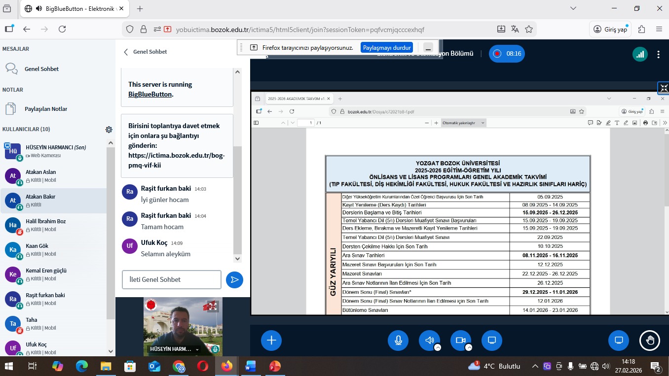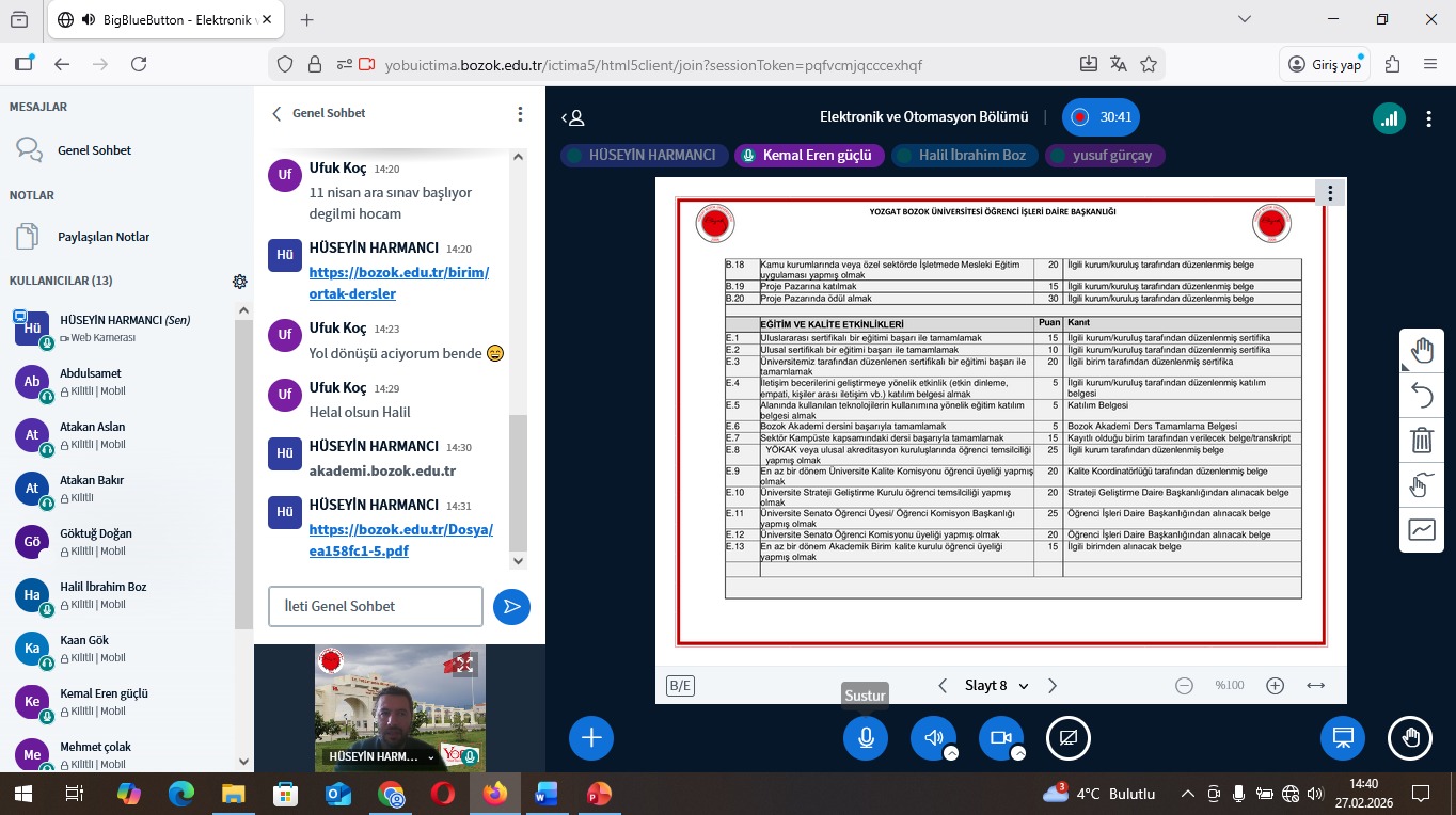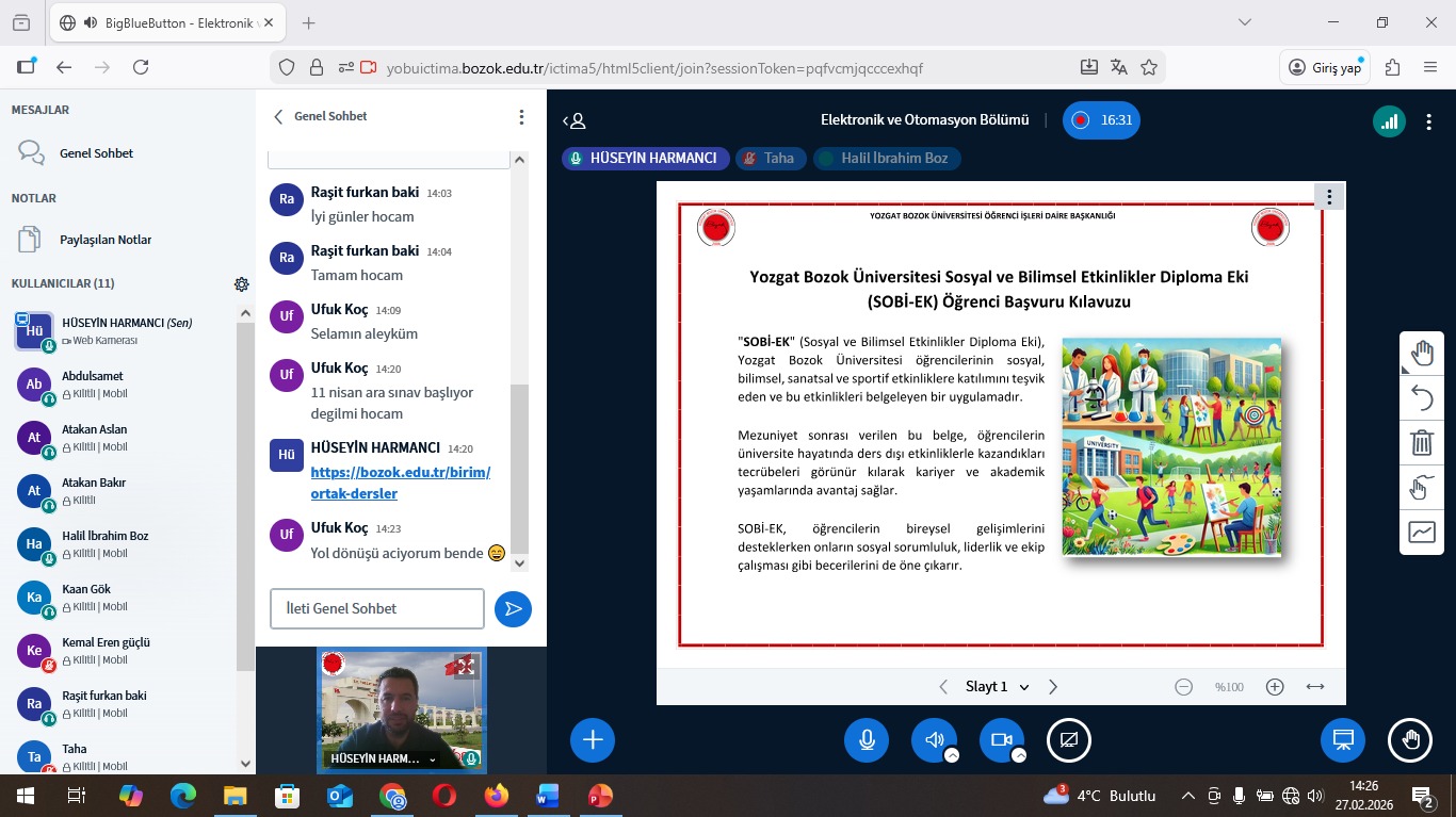 2. sınıf öğrencilerimizin akademik ve kişisel gelişimine yönelik akademik danışmanlık toplantısı 27.02.2026 tarihinde yapılmıştır. İşletmede Mesleki Eğitim yapan öğrenci sayısı fazla olduğu için çevrimiçi içtima uygulaması üzerinden yapılmıştır. Danışmanları Öğr. Gör. Hüseyin HARMANCI ile keyifli bir sohbet ortamında geçen toplantıda öğrencilerimizle 2 yıllık sürecin sonuna yaklaştığımız olmanın mutluluğu paylaşıldı. ÇAP öğrencisi Halil İbrahim BOZ arkadaşımızın başarılı şekilde Çift Diploma almaya hak kazandığı belirtilip tebrik edilmiştir. Öğrencilerimizin Yozgat Bozok Üniversitesi ve Boğazlıyan Meslek Yüksekokulunun sunmuş olduğu imkanlar iletilmiştir. Üniversitemizin diploma yanında ek olarak sunulan sosyal ve bilimsel etkinliklerde bulunan SOBİ-EK uygulaması tanıtılmıştır.Bu sisteme OBS üzerinden giriş yapan öğrencilerimizin durumları bu toplantı ile değerlendirilmiş ve düzeltmeler istenmiştir. Bu hususta öğrencilerimize destek verileceği belirtilmiştir.