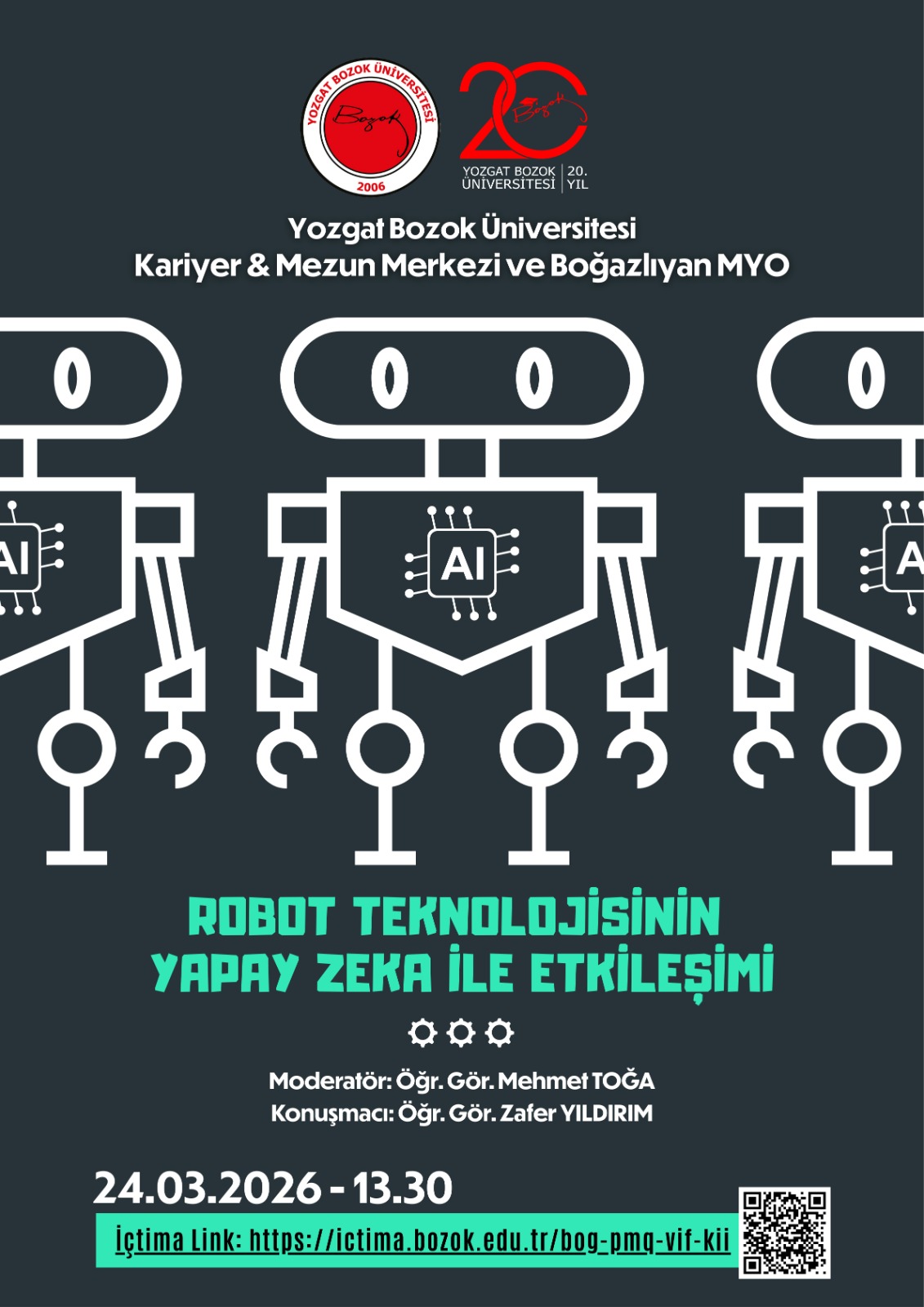 “Robot Teknolojisinin Yapay Zeka ile Etkileşimi” konulu çevrim içi buluşma etkinliği, 24 Mart 2026 tarihinde saat 13:30’da gerçekleştirilecektir. Etkinliğin moderatörlüğünü Öğr. Gör. Mehmet Toğa üstlenirken, konuşmacı olarak Kayseri Üniversitesi’nden Öğr. Gör. Zafer Yıldırım yer alacaktır.