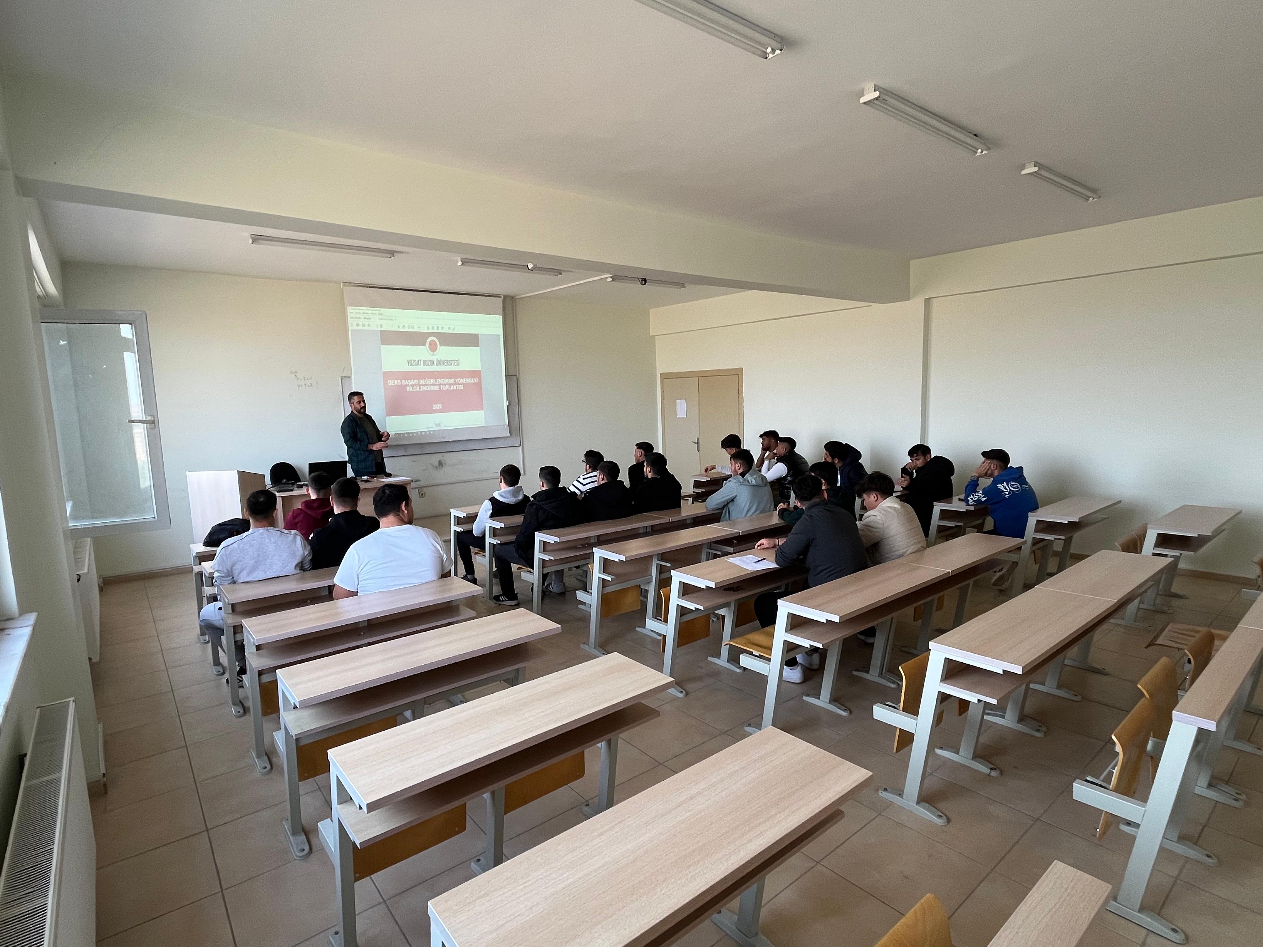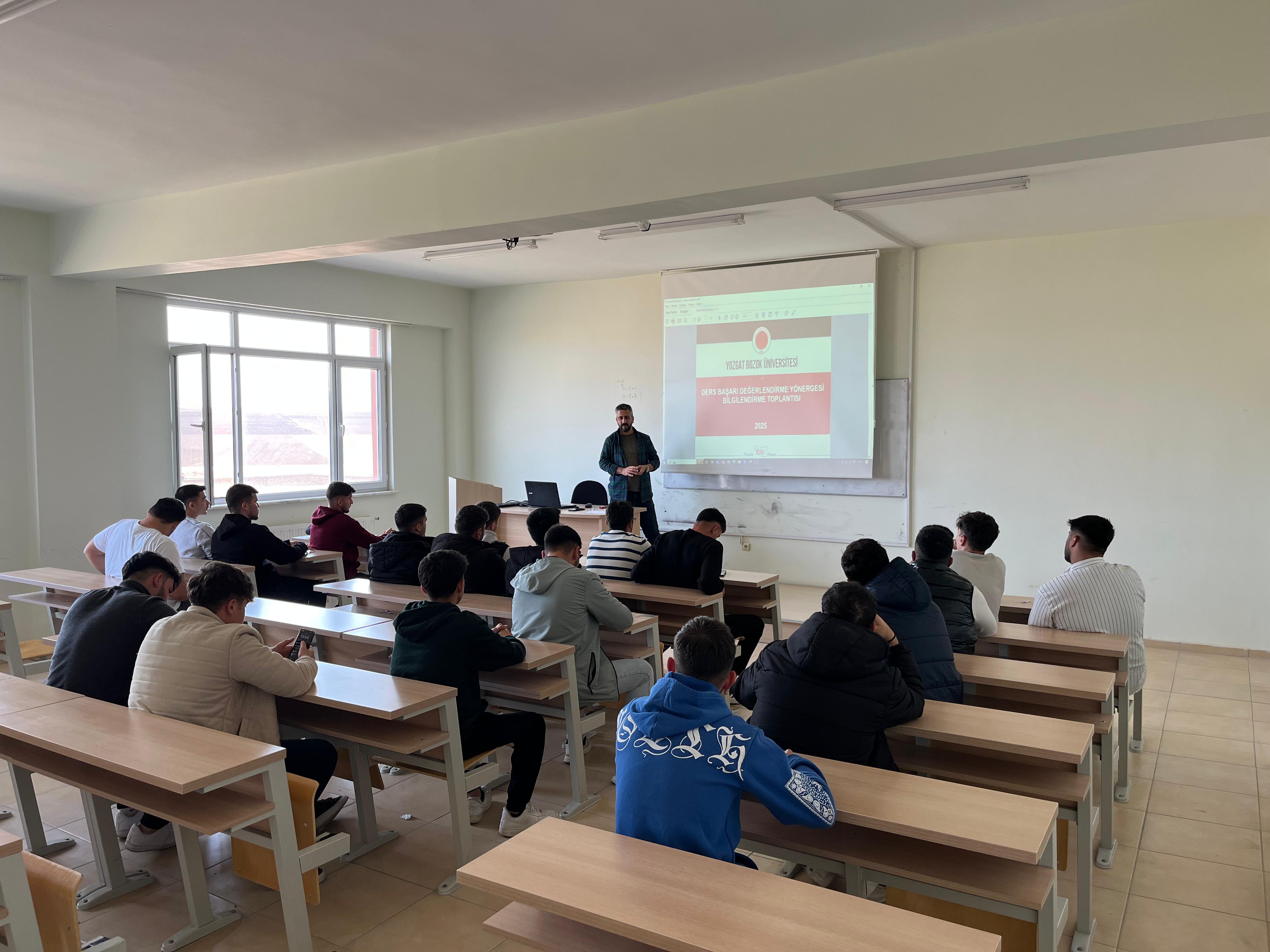 Bölümümüz öğretim elemanları, Üniversitemiz Eğitim Öğretim Komisyonu ve ilgili daire başkanlıklarınca "Yozgat Bozok Üniversitesi Ön Lisans ve Lisans Eğitim-Öğretim ve Sınav Yönetmeliği" nde yapılan değişikliklerin anlatıldığı eğitime katılmıştır. Söz konusu eğitimde öğrencilerimizi bilgilendirmek amacıyla 06.11.2025 tarihinde saat 13:45 de Derslik 7 de 1. ve 2. sınıf öğrencilerimiz ile bir araya gelerek bilgi aktarımında bulunduk. Bölüm Başkanımız Öğr. Gör. Mehmet TOĞA önemli değişiklikleri öğrencilerimize aktarmıştır. Söz konusu eğitim sonrasında öğrencilerimize anket gönderilmiştir.