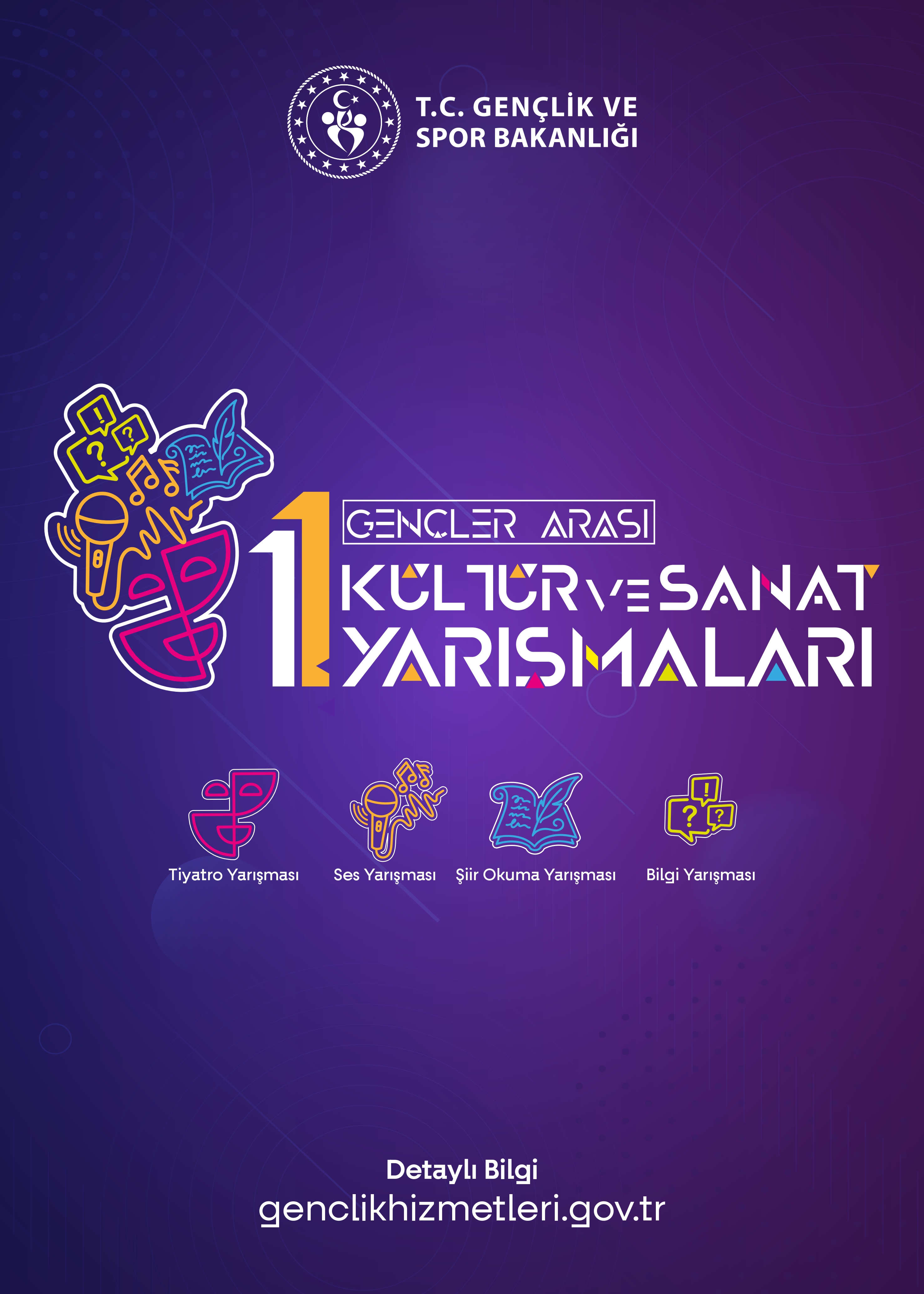 Gençlik ve Spor Bakanlığı Gençlik Hizmetleri Genel Müdürlüğü tarafından; gençlerimizin geleneksel sanatlarımıza sahip çıkmalarını sağlamak, özgüven ve sorumluluk duygularını geliştirmek, toplum içerisinde kendilerini sözlü olarak ifade edebilmelerine imkân tanımak ve kültürümüzün gençler tarafından benimsenmesine katkı sağlamak amacıyla “Gençler Arası Kültür ve Sanat Yarışmaları” düzenlenecektir.
