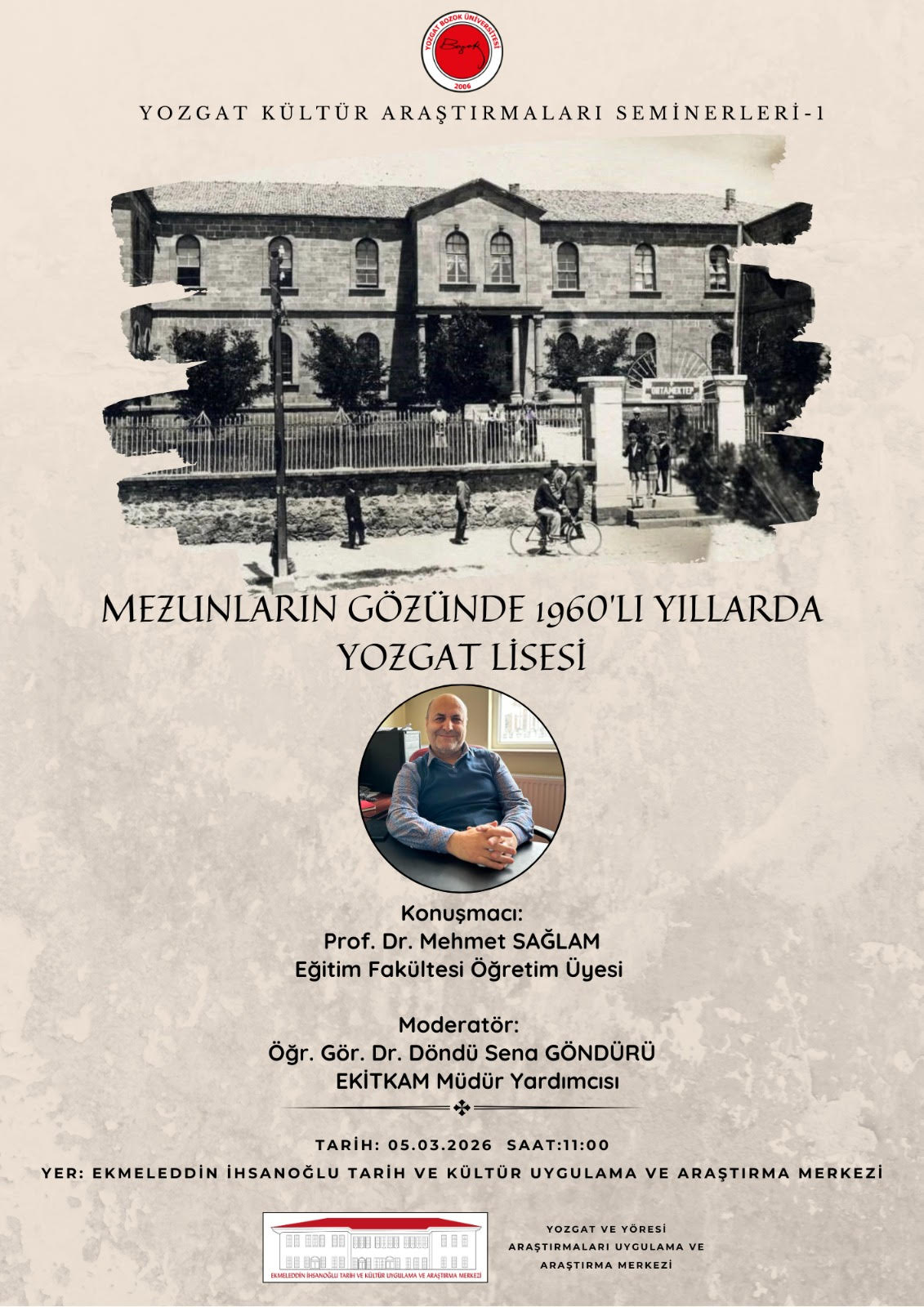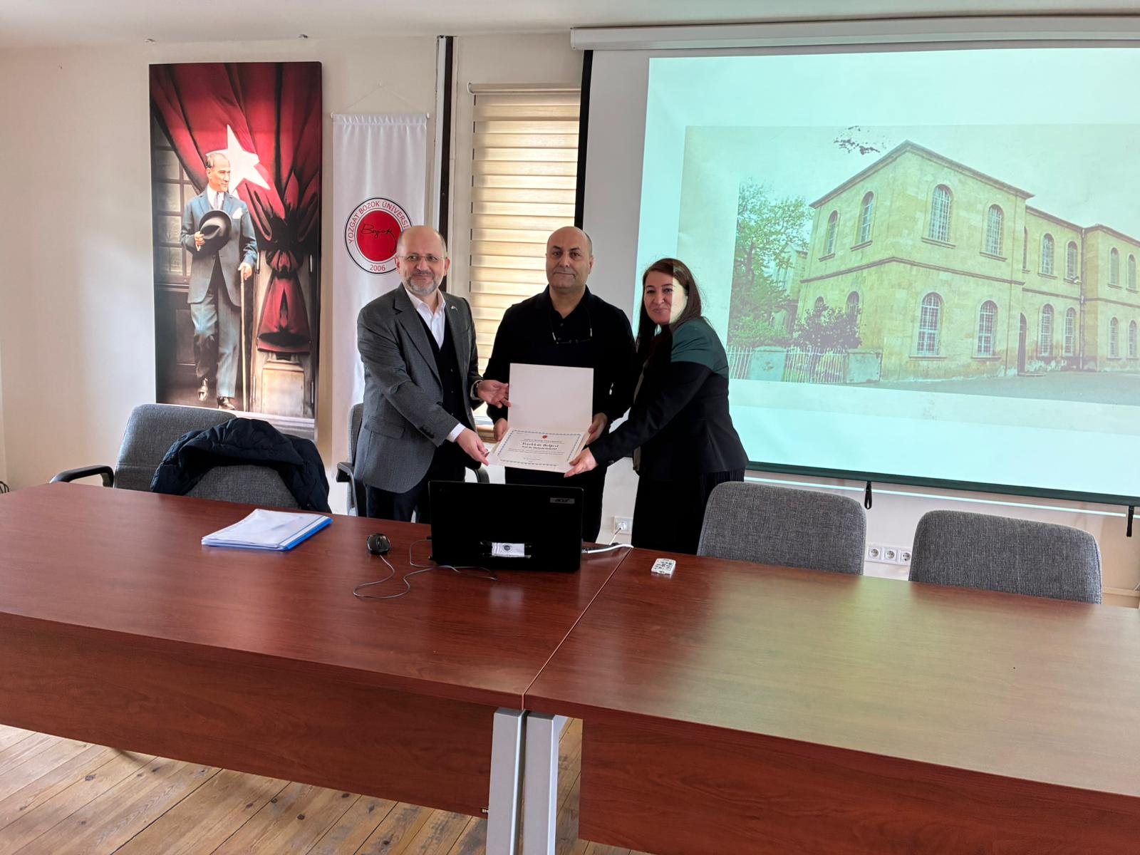 Yozgat ve Yöresi Araştırmaları Uygulama ve Araştırma Merkezi (EKİTKAM) tarafından düzenlenen "Yozgat Kültür Araştırmaları Seminerleri" serisinin ilk oturumu, fakültemiz öğretim üyelerinden Prof. Dr. Mehmet SAĞLAM'ın değerli sunumlarıyla gerçekleştirildi. Ekmeleddin İhsanoğlu Tarih ve Kültür Uygulama ve Araştırma Merkezi’nde düzenlenen etkinlikte Prof. Dr. Mehmet SAĞLAM, "Mezunların Gözünde 1960’lı Yıllarda Yozgat Lisesi" başlıklı sunumuyla şehrimizin eğitim tarihindeki en önemli simgelerinden biri olan Yozgat Lisesi’nin o dönemdeki sosyo-kültürel yapısını ve eğitim iklimini katılımcılarla paylaştı. Fakültemiz öğretim üyelerinin şehrin kültürel ve tarihi mirasına sunduğu katkılar kapsamında gerçekleşen bu anlamlı seminerde, geçmişin eğitim tecrübesi günümüz perspektifiyle yeniden yorumlandı. Sunumun ardından katılımcıların sorularını yanıtlayan hocamız, 1960'lı yılların disiplin ve başarı odaklı eğitim anlayışına dair önemli anekdotlar aktardı. Değerli hocamızı bu kıymetli sunumundan ve şehrimizin eğitim belleğine sağladığı katkılardan dolayı tebrik eder; organizasyonu düzenleyen EKİTKAM birimine teşekkür ederiz.