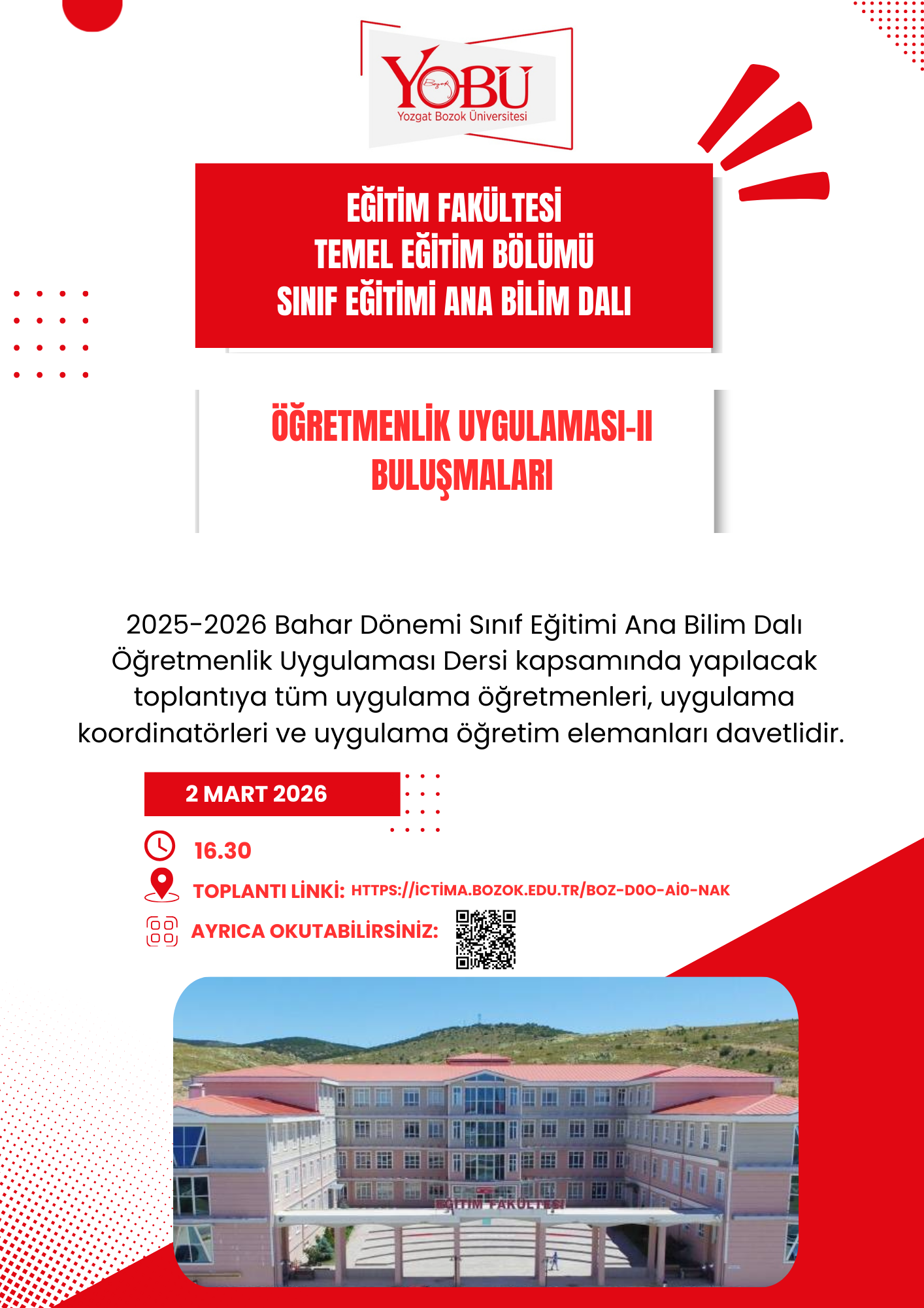 Yozgat Bozok Üniversitesi Eğitim Fakültesi Temel Eğitim Bölümü Sınıf Eğitimi Ana Bilim Dalı tarafından, 2025–2026 Eğitim-Öğretim Yılı Bahar Dönemi kapsamında yürütülen Öğretmenlik Uygulaması II Dersi çerçevesinde “Öğretmenlik Uygulaması-II Buluşmaları” gerçekleştirilecektir.