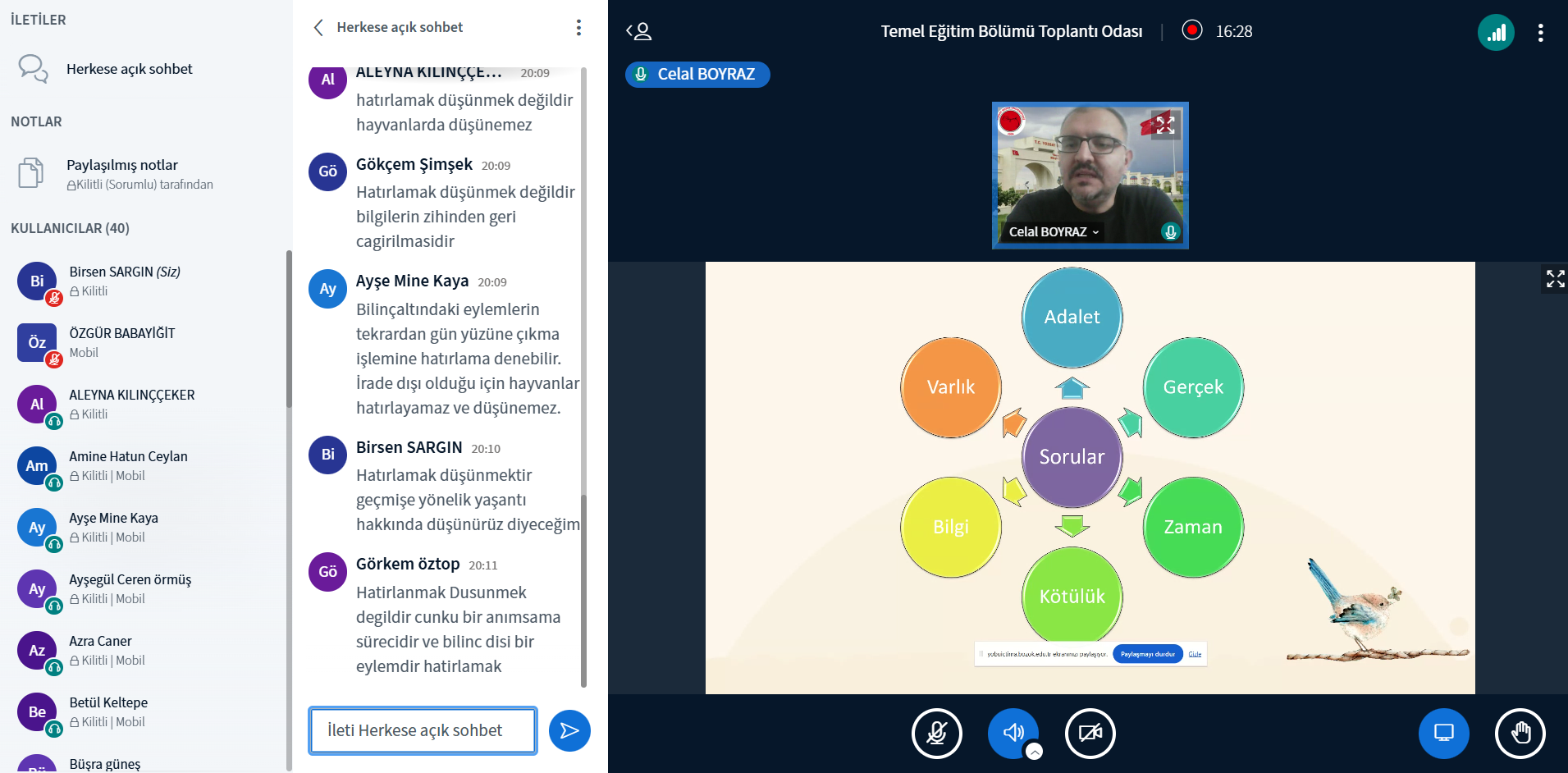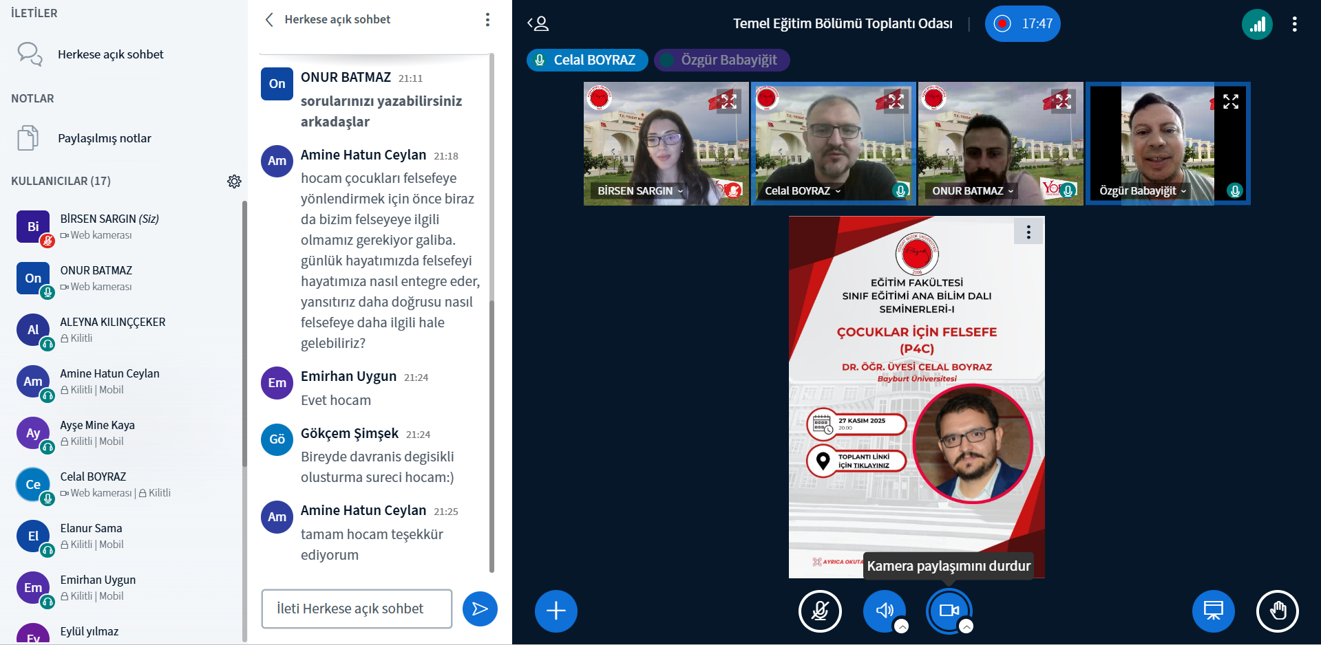 Seminerde, Çocuklar için Felsefe yaklaşımının kuramsal temelleri, eğitimdeki yeri ve çocukların düşünme becerileri üzerindeki etkileri ele alındı. Dr. Öğr. Üyesi Celal Boyraz, P4C’nin çocuklarda eleştirel düşünme, sorgulama, problem çözme, empati ve iletişim becerilerini geliştirmeye yönelik güçlü bir eğitim yaklaşımı olduğunu vurguladı. Ayrıca öğretmen adaylarının sınıf ortamında bu yöntemi nasıl uygulayabileceklerine ilişkin örnek etkinlikler ve uygulama sürecine dair önemli ipuçları paylaşıldı.