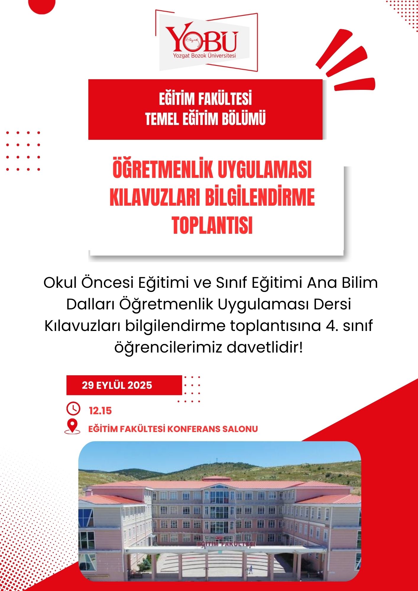 Okul Öncesi Eğitimi ve Sınıf Eğitimi anabilim dallarındaki 4. sınıf öğrencilerimiz için düzenlenecek olan Öğretmenlik Uygulaması Dersi Kılavuzları bilgilendirme toplantısına tüm 4. sınıf öğrencilerimizin eksiksiz katılım göstermeleri önemle rica olunur.